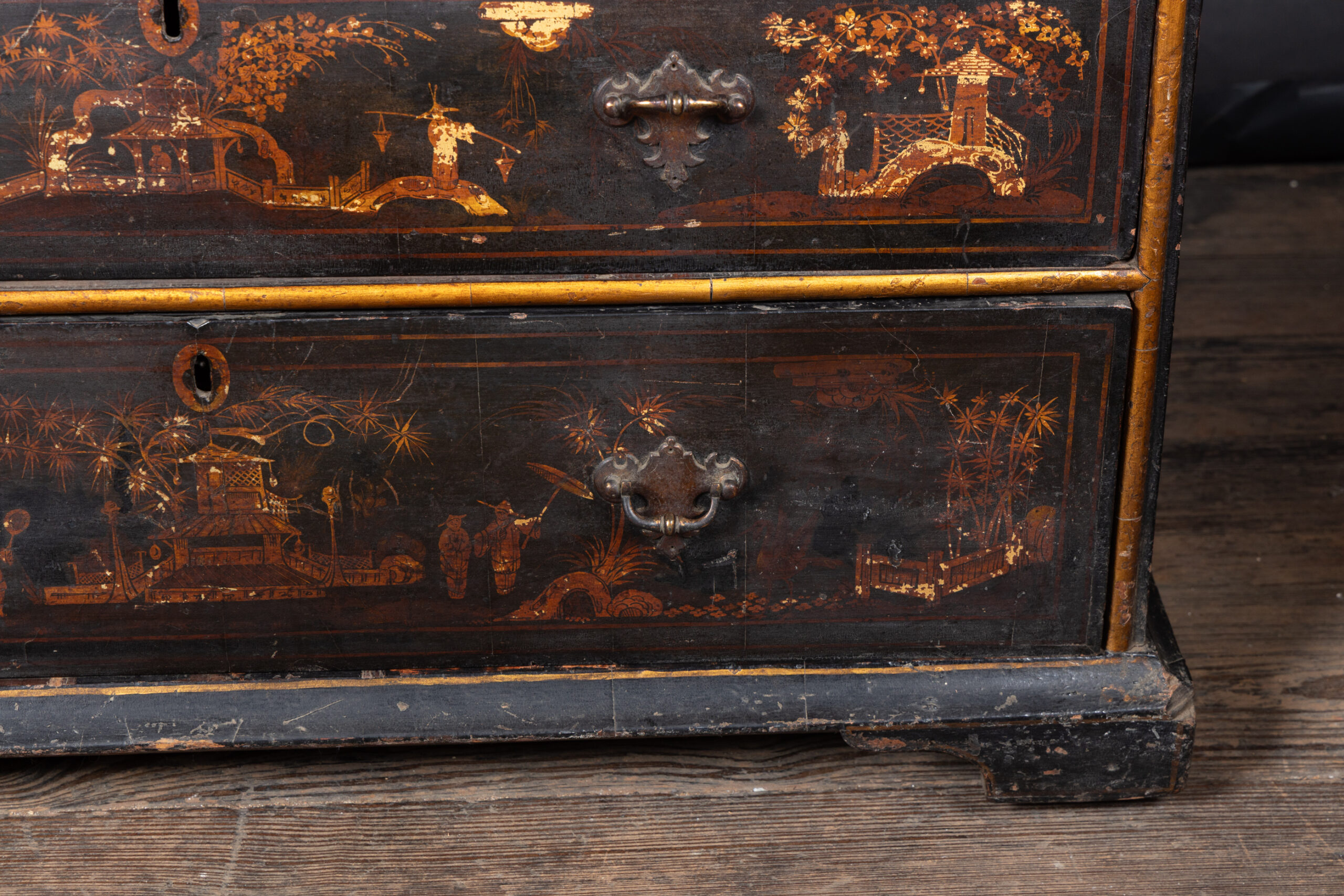 This striking French black lacquered Chinoiserie secretaire abbatant (fall front secretary) is beautifully adorned in golden raised Chinese scenes with flora and fauna. The 19th century piece features bronze pulls and escutcheons on top, and five drawers at the bottom. The secretary is decorated with a heavy crown, trimmed in gold with gold pastoral scenes below. The interior is lined in green fabric with one shelf in the upper half.