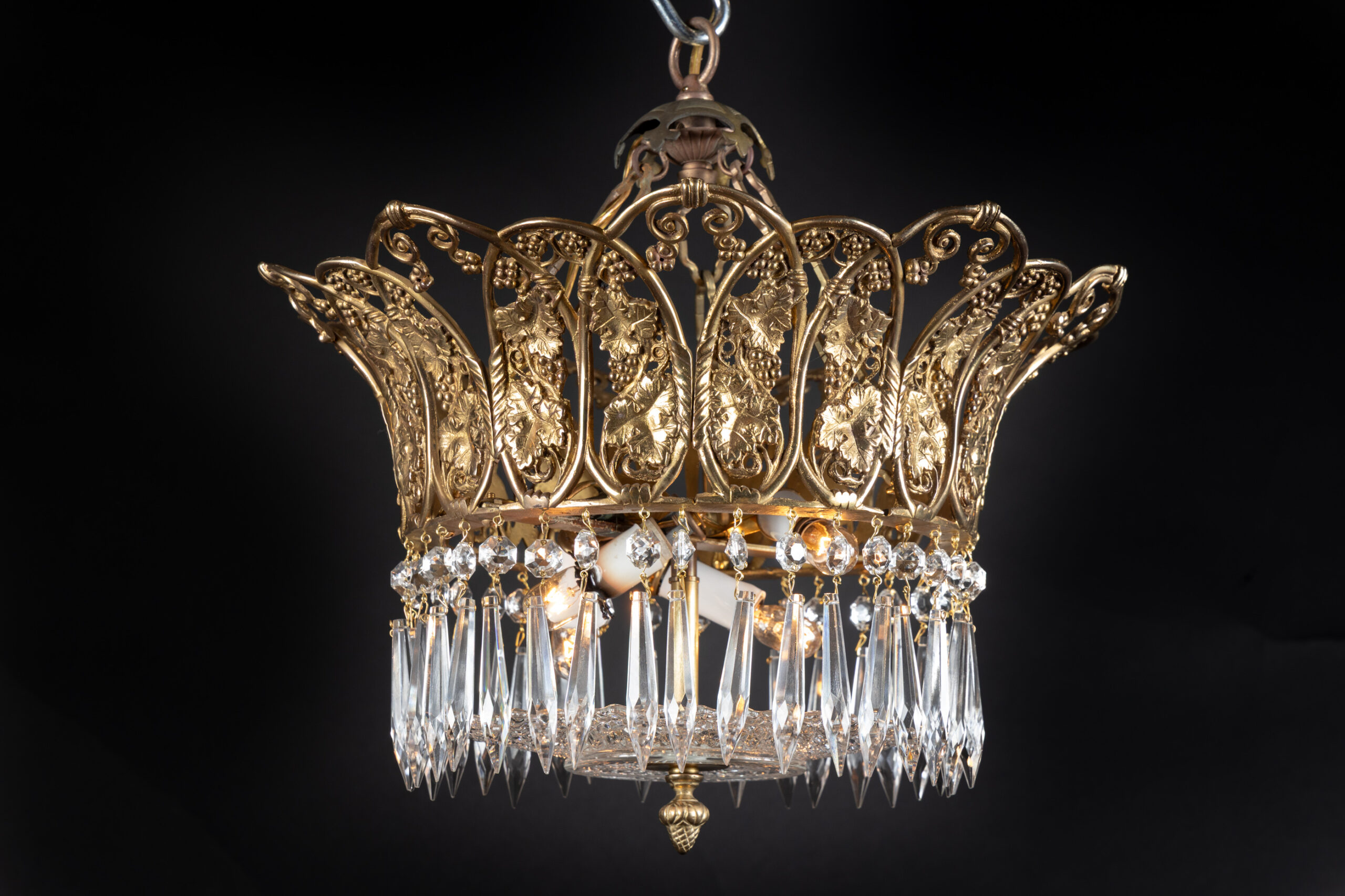 This beautiful early 20th century French chandelier features fantastic crystal work, a beautiful cut crystal center dish, and a delicately ornate crown. The crown features a grape motif, alluding to Bacchus the god of wine. Its bronze glimmers in the light from 4 intertwining interior bulbs. Beads of crystal, octagonally cut pieces first, then pointed tear drops hang below. A beautiful cut crystal dish with is suspended in the center of this light fixture.