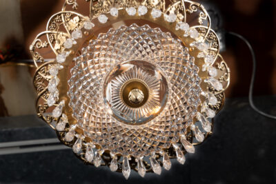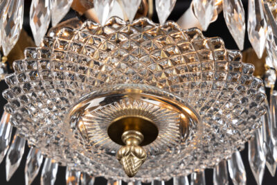 This beautiful early 20th century French chandelier features fantastic crystal work, a beautiful cut crystal center dish, and a delicately ornate crown. The crown features a grape motif, alluding to Bacchus the god of wine. Its bronze glimmers in the light from 4 intertwining interior bulbs. Beads of crystal, octagonally cut pieces first, then pointed tear drops hang below. A beautiful cut crystal dish with is suspended in the center of this light fixture.