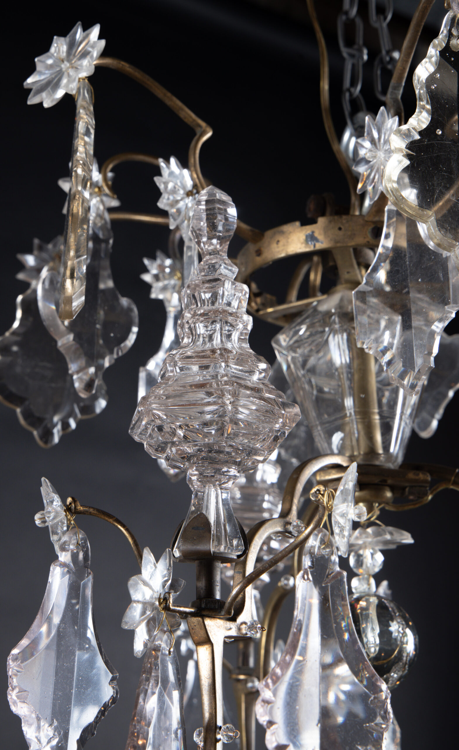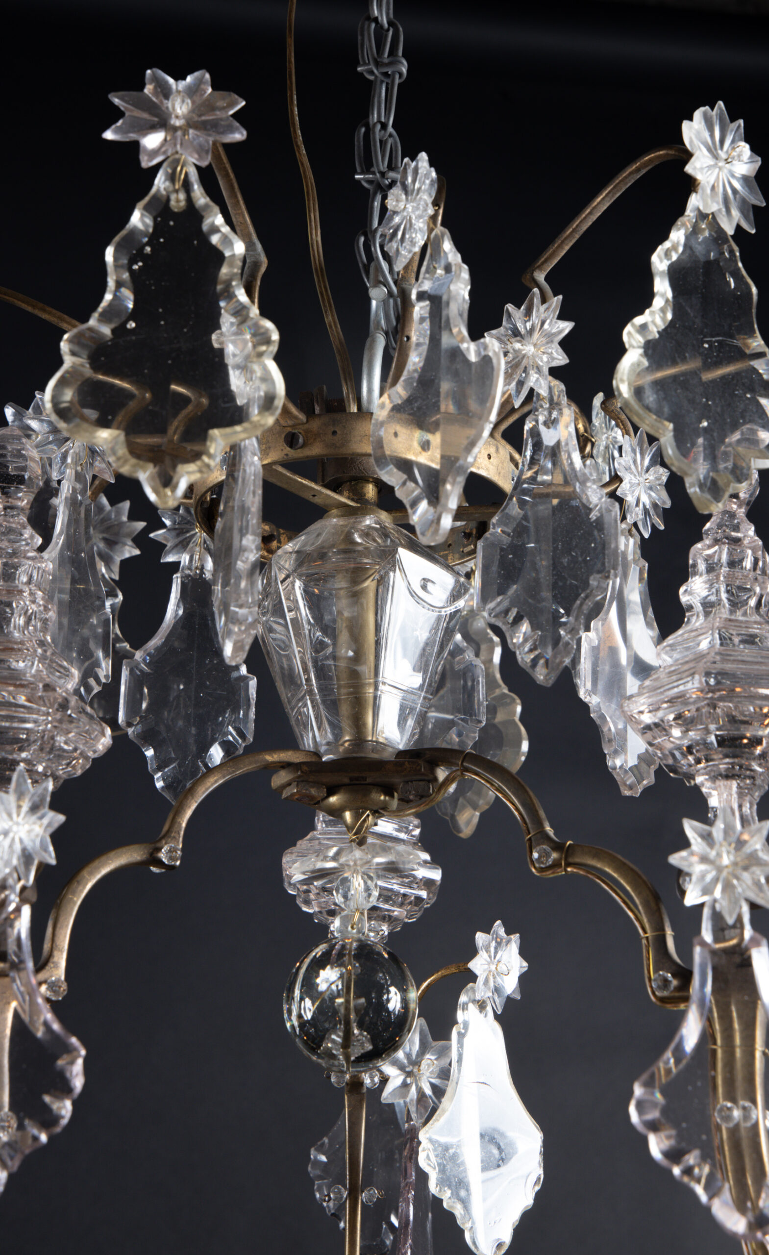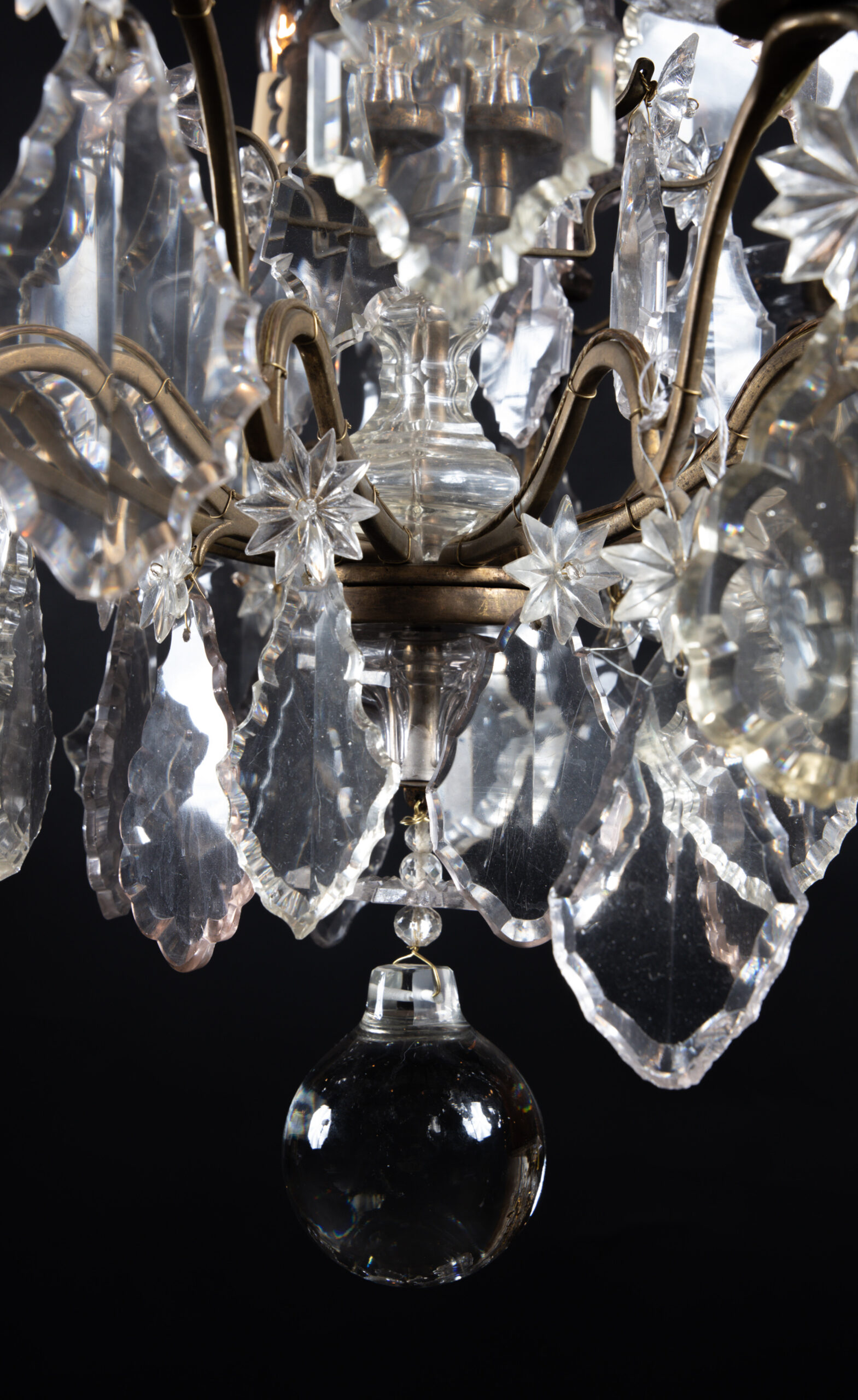 French 19th century Louis XV bronze and crystal chandelier with six crystal spears and one central spear featuring large crystal plaquettes. The piece ends with a beautiful solid crystal ball.
