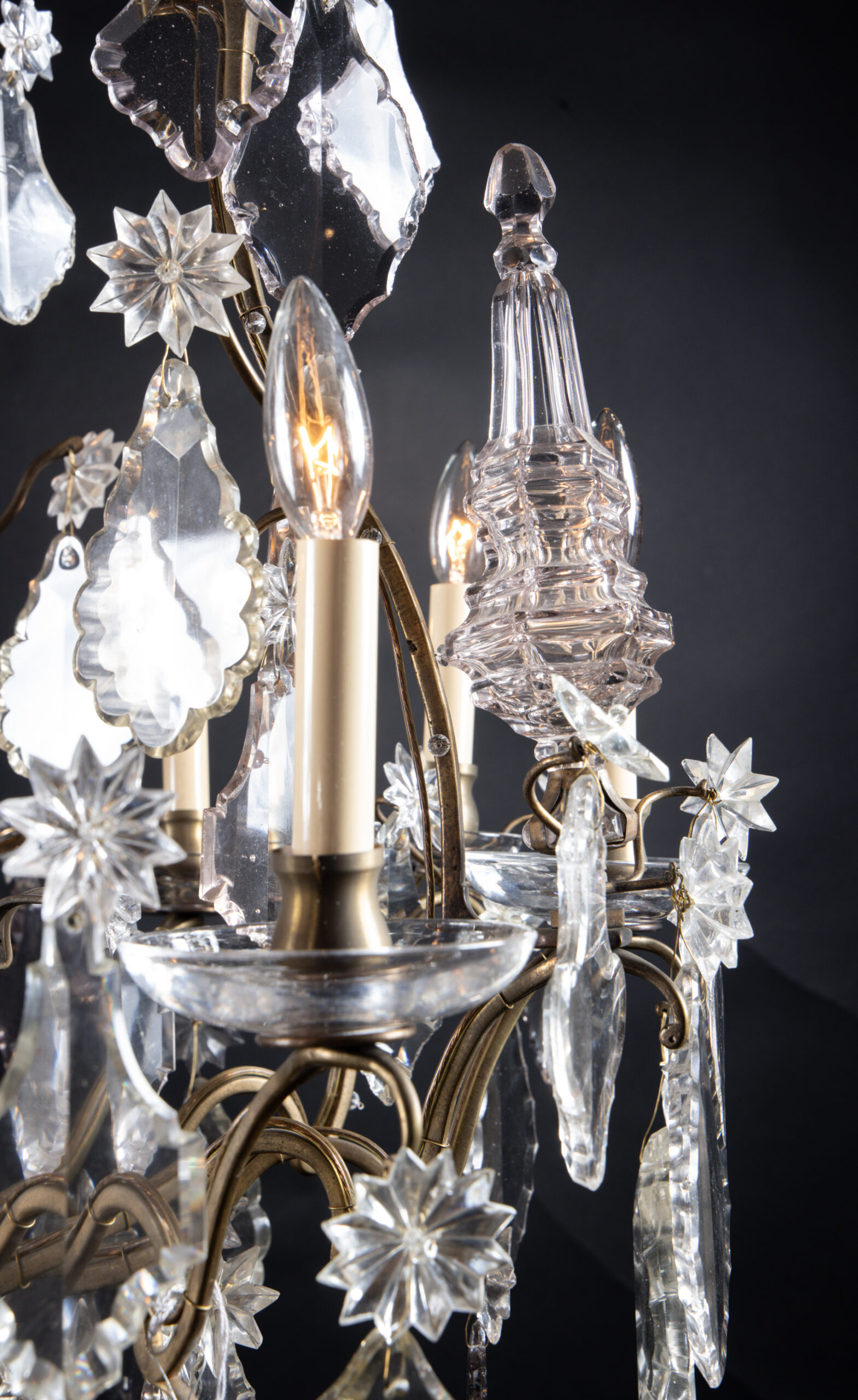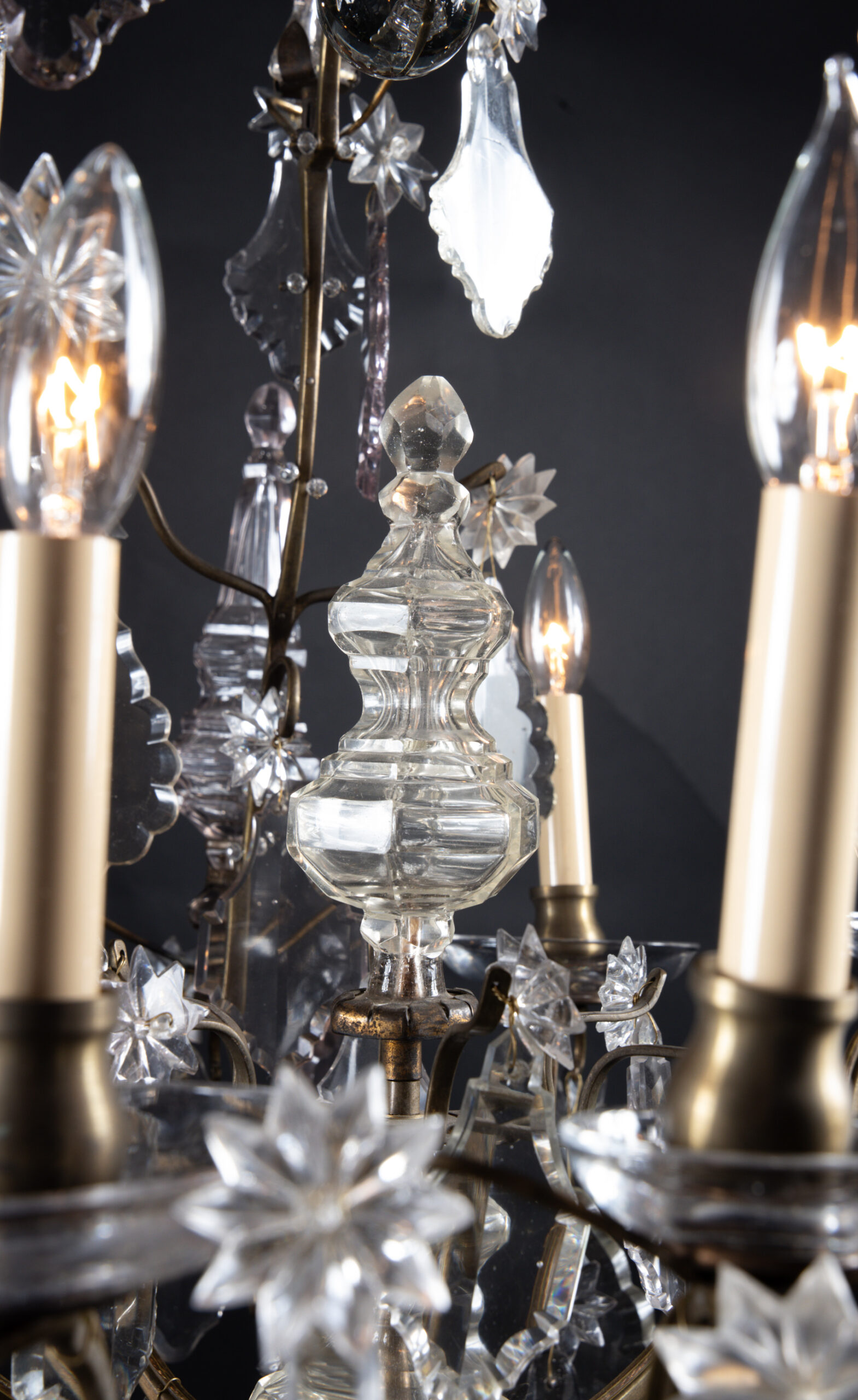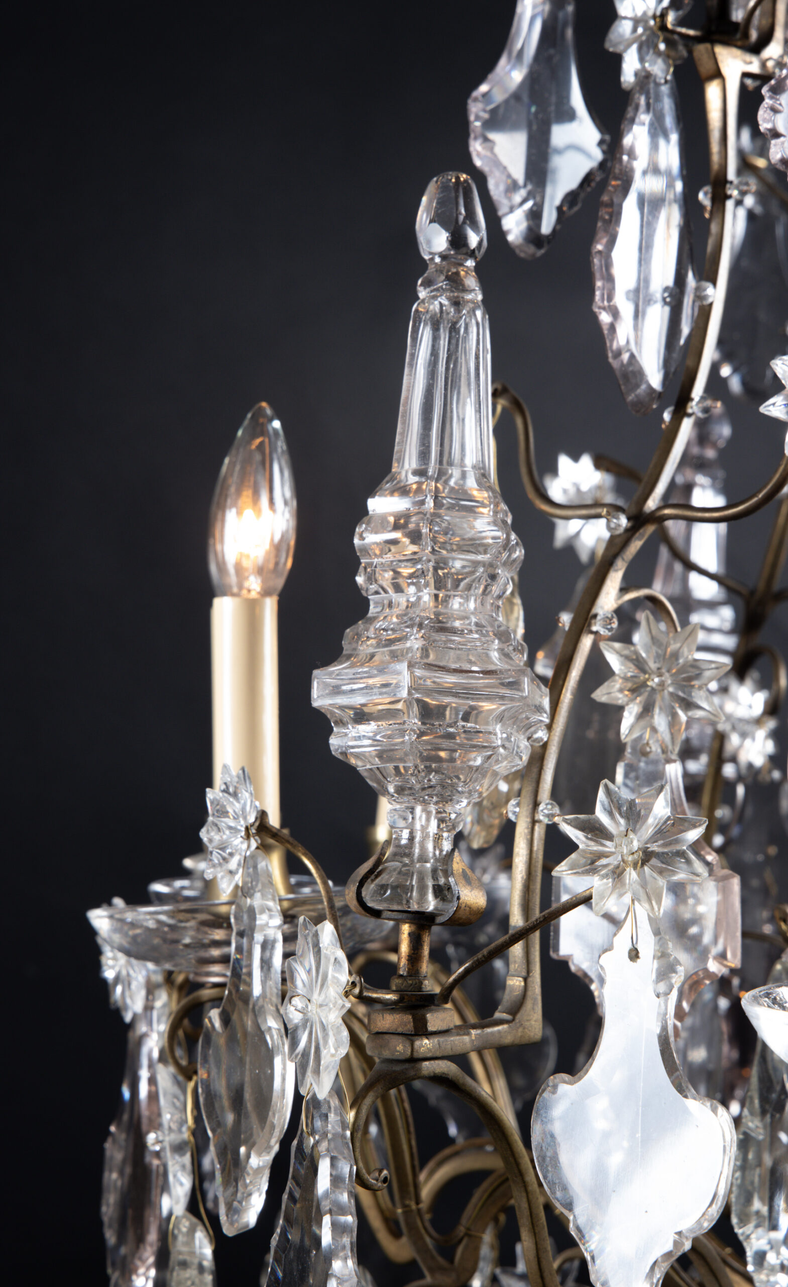 French 19th century Louis XV bronze and crystal chandelier with six crystal spears and one central spear featuring large crystal plaquettes. The piece ends with a beautiful solid crystal ball.