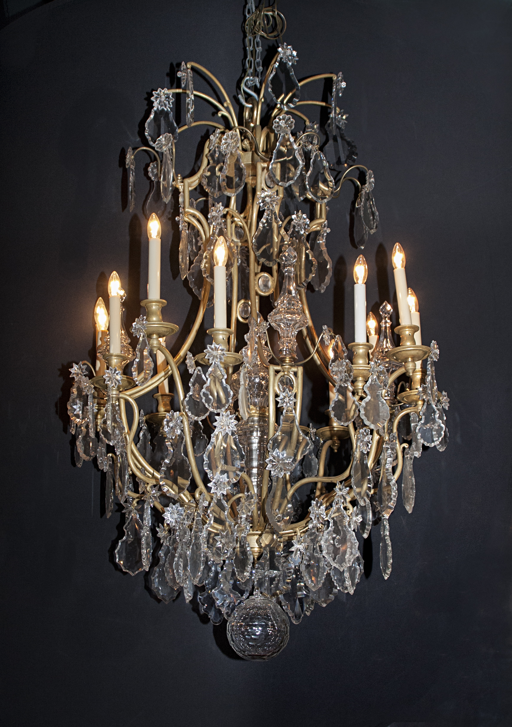 French Louis XV bronze d’ore and crystal chandelier draped with large crystal plaquettes, crystal spears, crystal center, round faceted crystal stones and a large faceted crystal finial