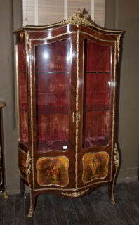 French 19th Century Louis XV two door Vernis Martin curio cabinet with curved glass and bronze mounts