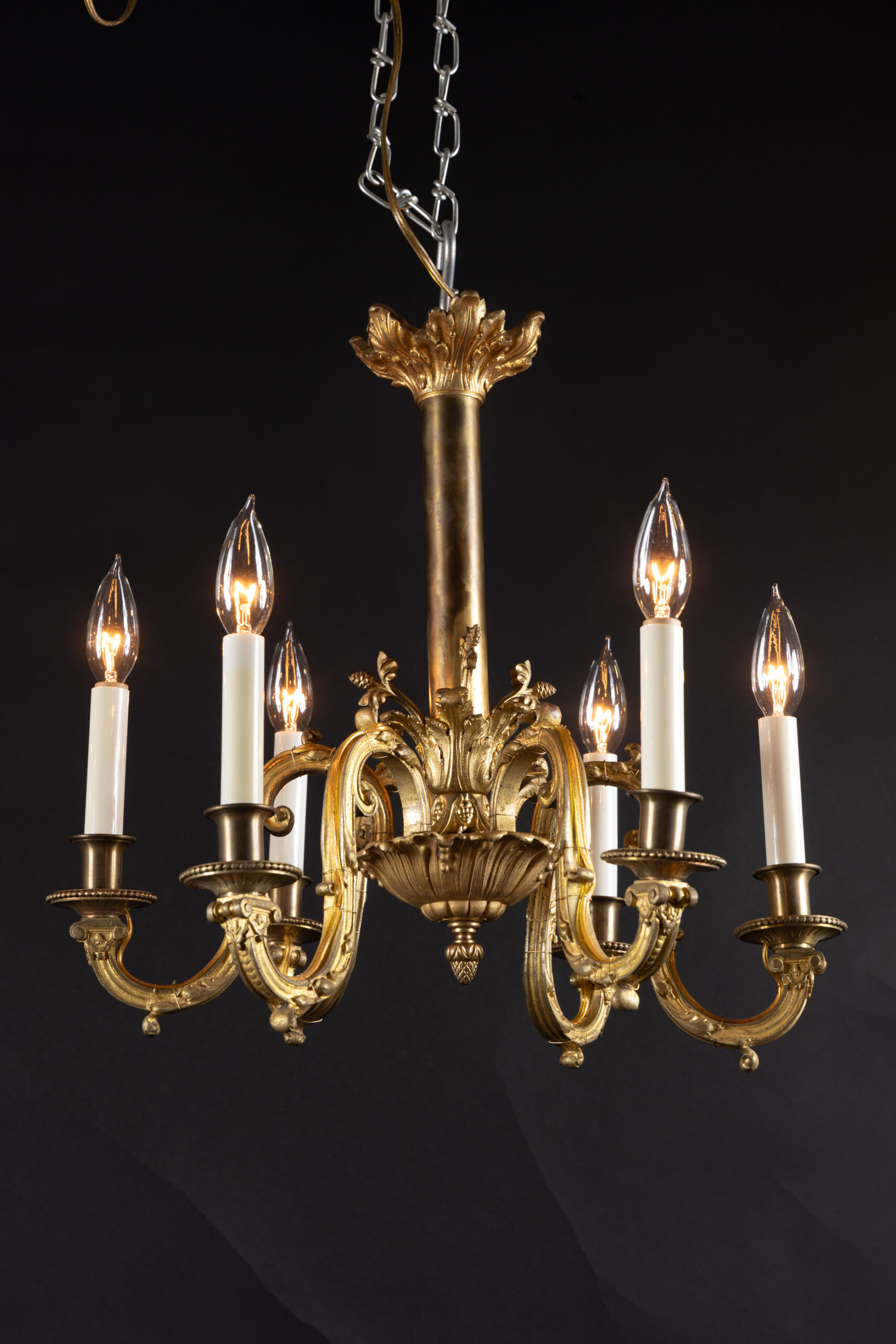 French 19th century Louis XVI bronze chandelier with bronze candle cups & bobeches with beaded edges, adorned with floriate center, acanthus leaves on each arm and acorn finial at bottom. The chandelier features six lights under a detailed crown.