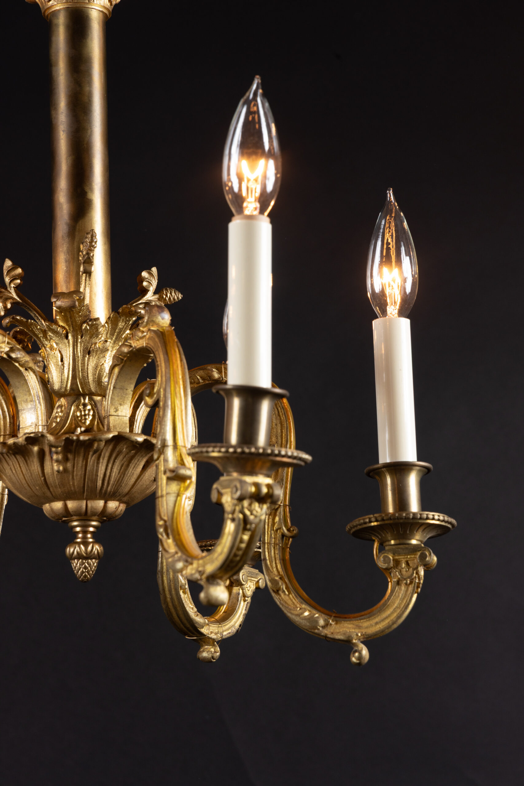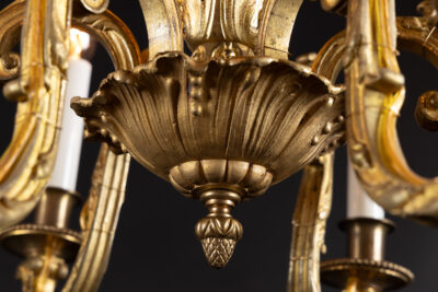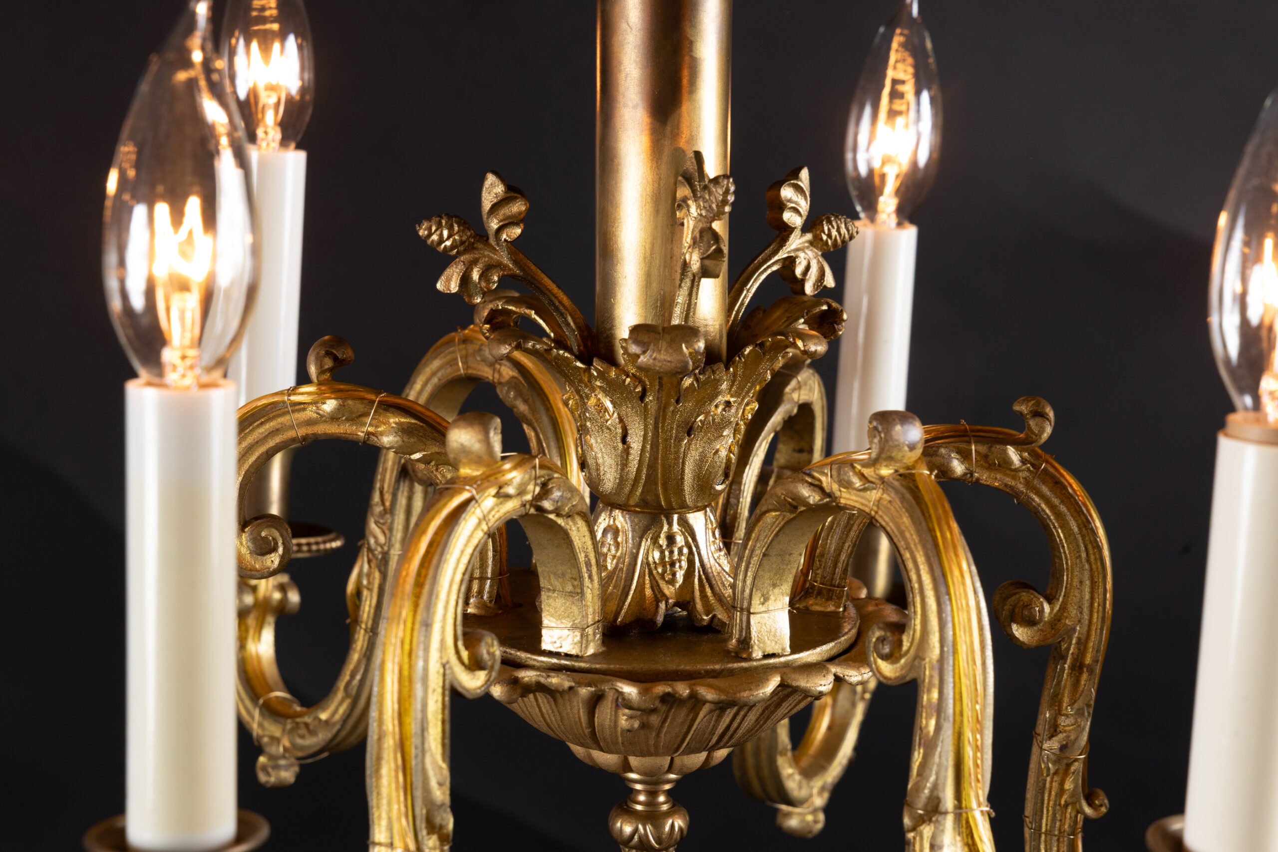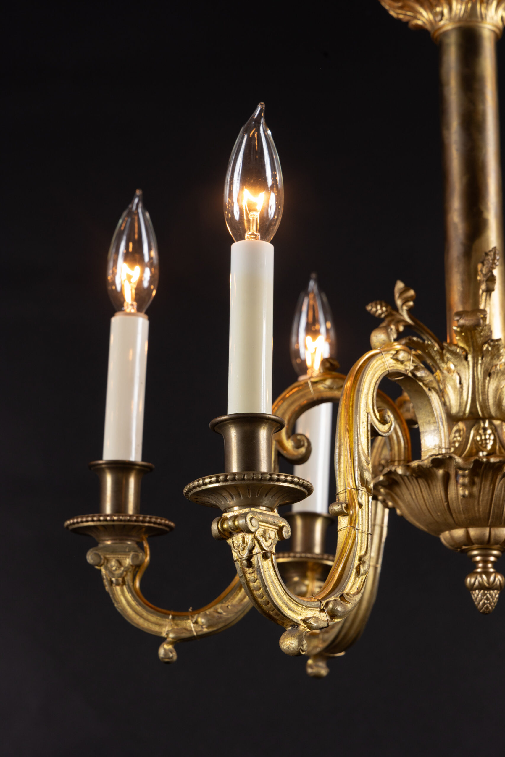 French 19th century Louis XVI bronze chandelier with bronze candle cups & bobeches with beaded edges, adorned with floriate center, acanthus leaves on each arm and acorn finial at bottom. The chandelier features six lights under a detailed crown.