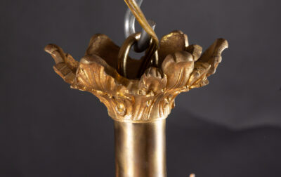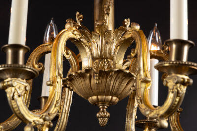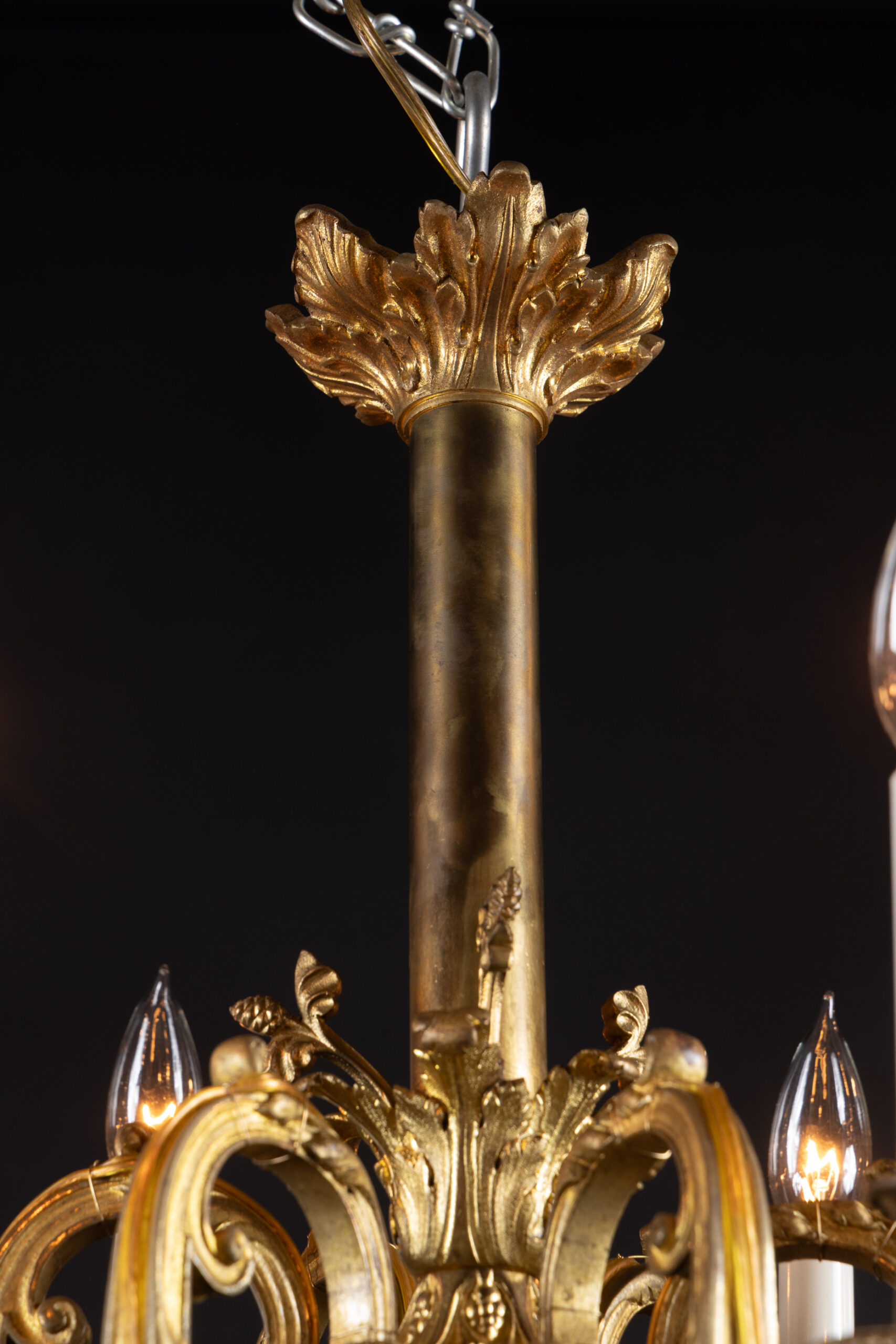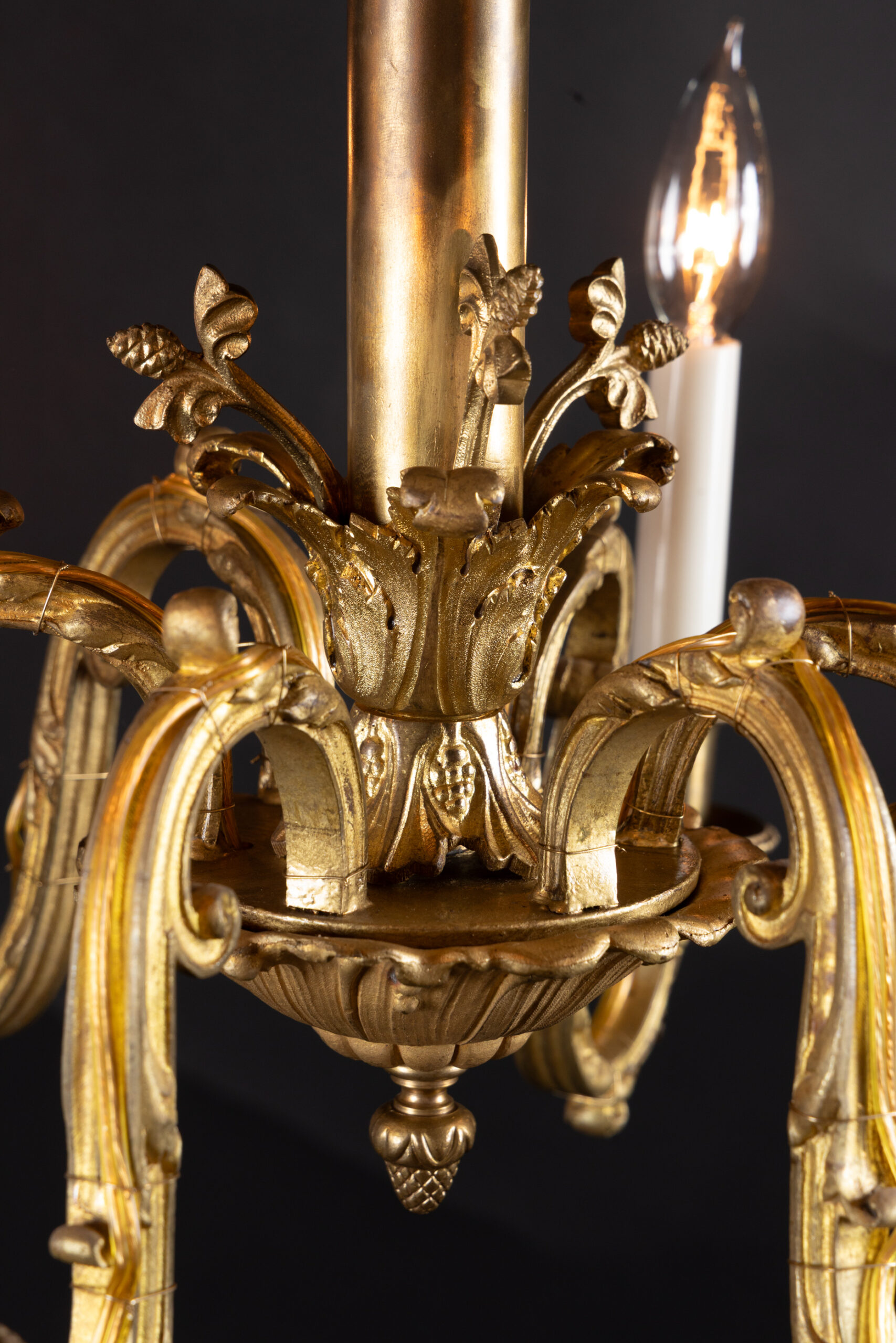 French 19th century Louis XVI bronze chandelier with bronze candle cups & bobeches with beaded edges, adorned with floriate center, acanthus leaves on each arm and acorn finial at bottom. The chandelier features six lights under a detailed crown.