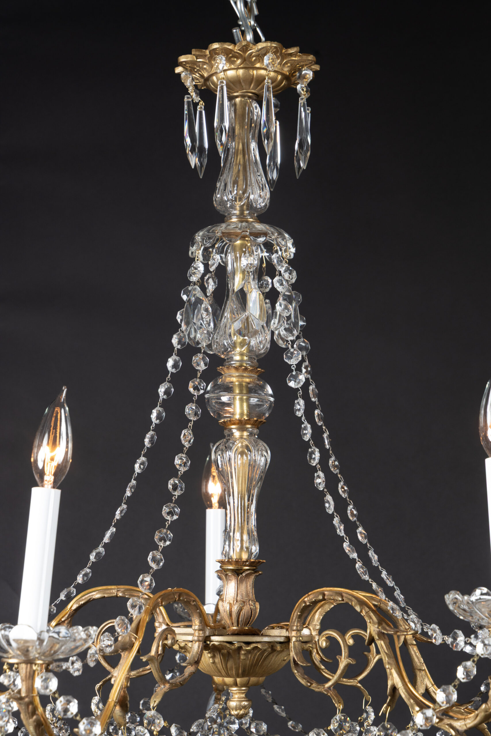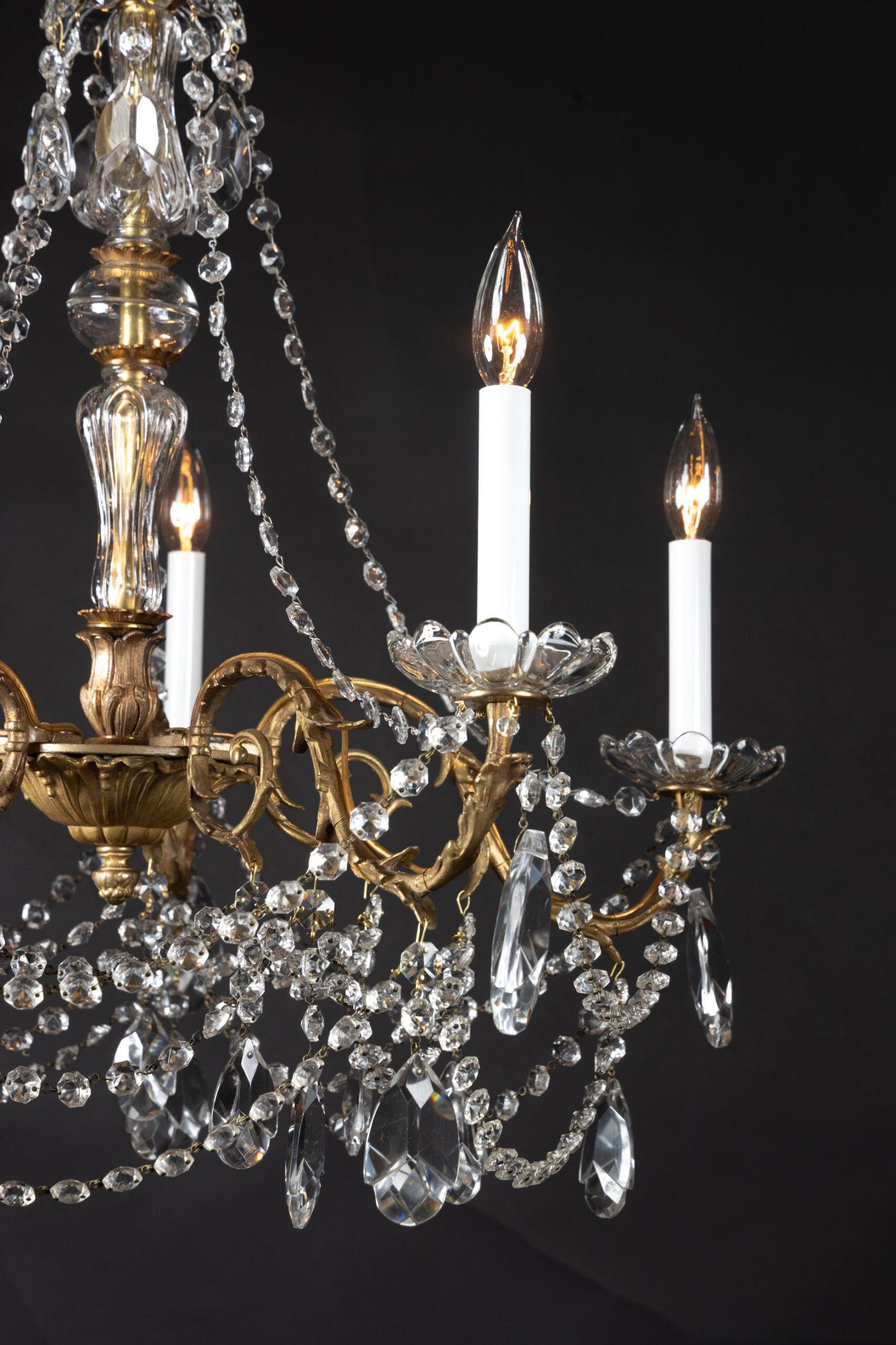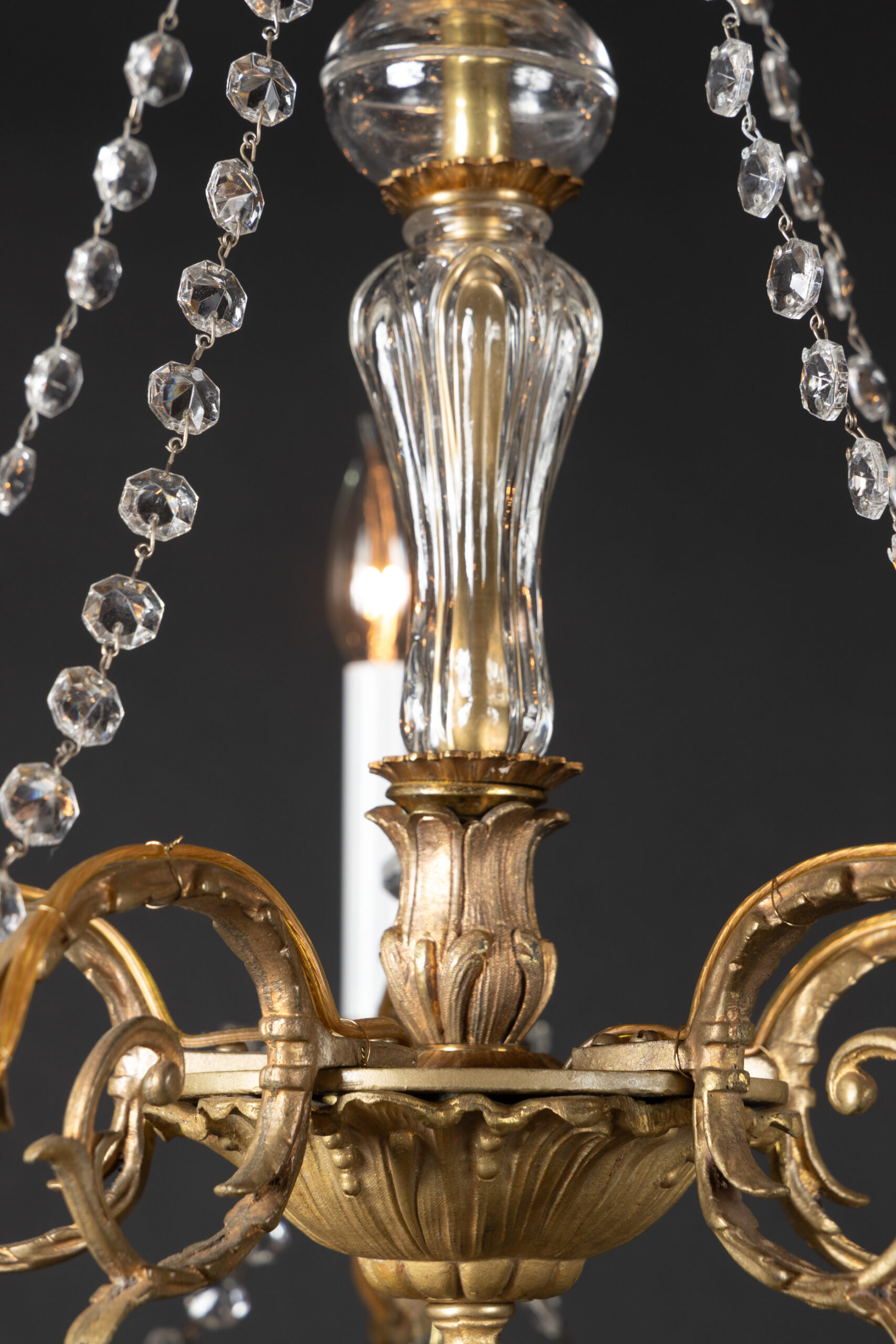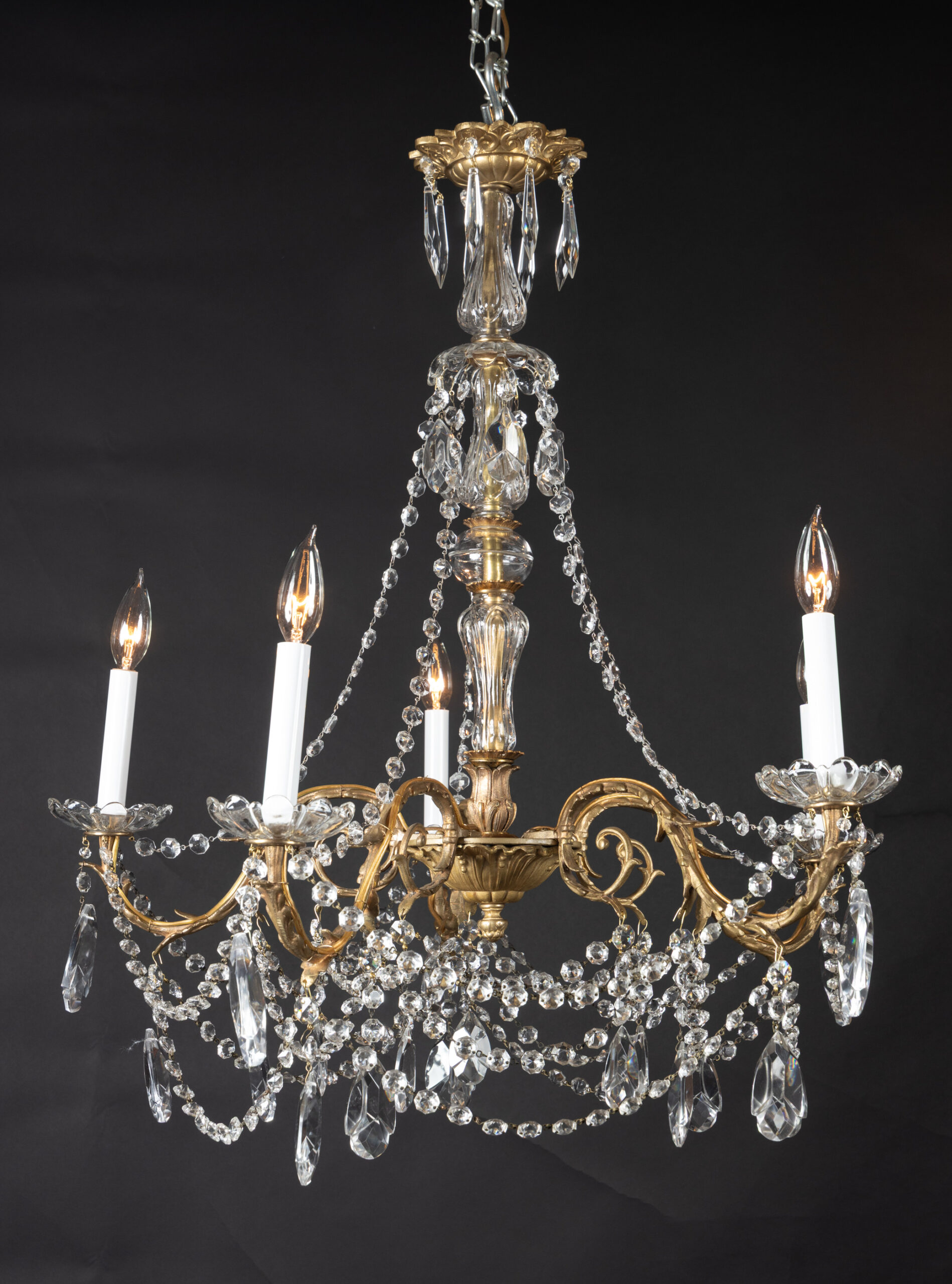 Featuring a fine French 19th century Louis XVI bronze chandelier with bronze cups and drippers. The chandelier features a detailed crown at top followed by crystal spears below. The central stem is surrounded by unique vase shaped crystal elements. Each arm features simple, yet detailed curving elements and is finished with fine crystal bobeches under each of the five lights. The chandelier is draped with crystal beads and beautiful plaquettes at bottom. Each of these elements combines to make a uniquely French light fixture, poised to bring a French charm to any interior design and to be a focal point of any room in which it is found.Â