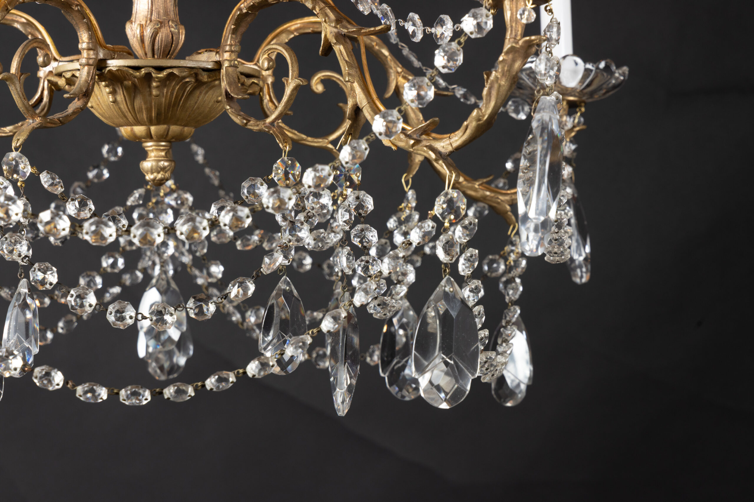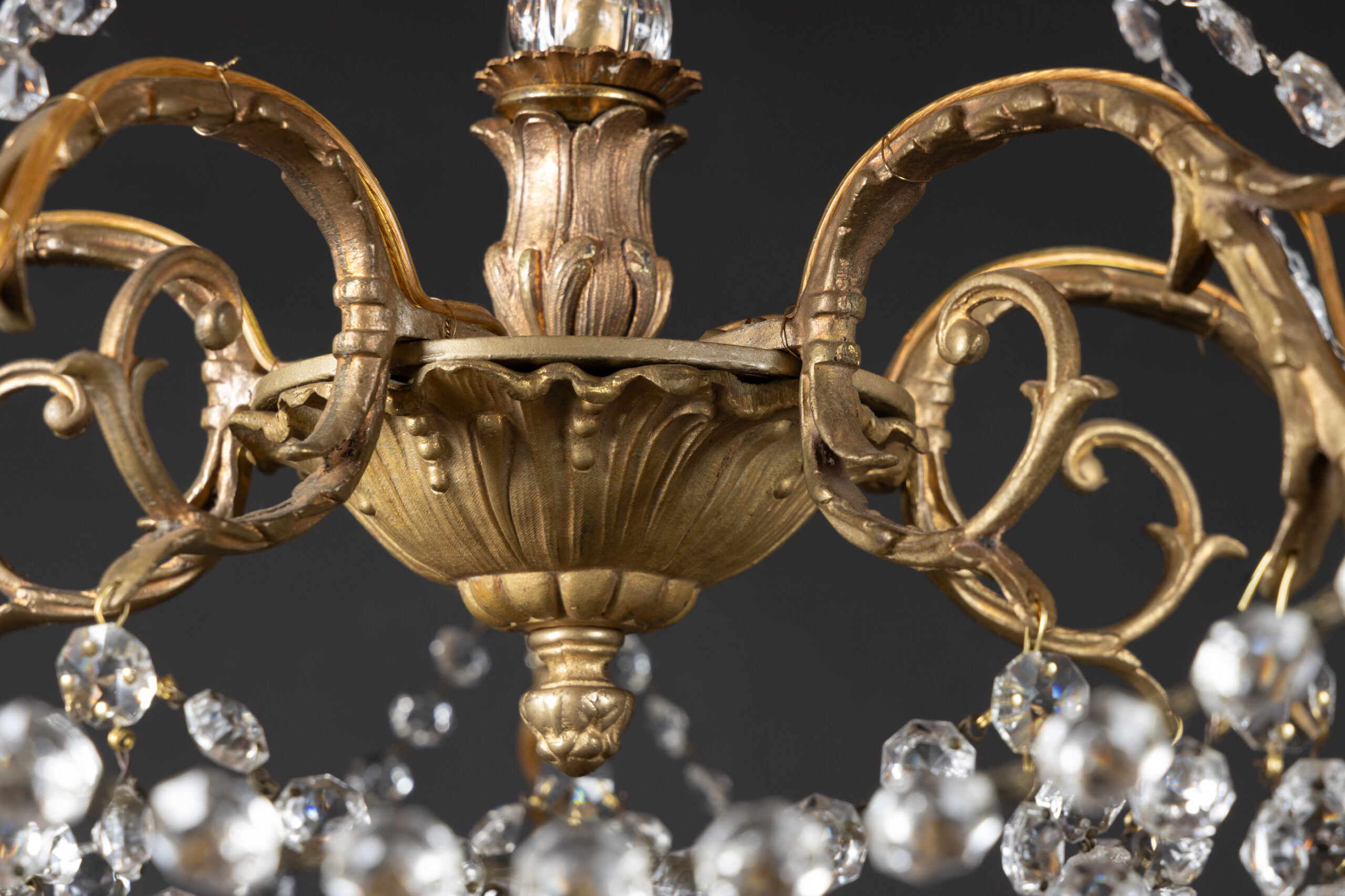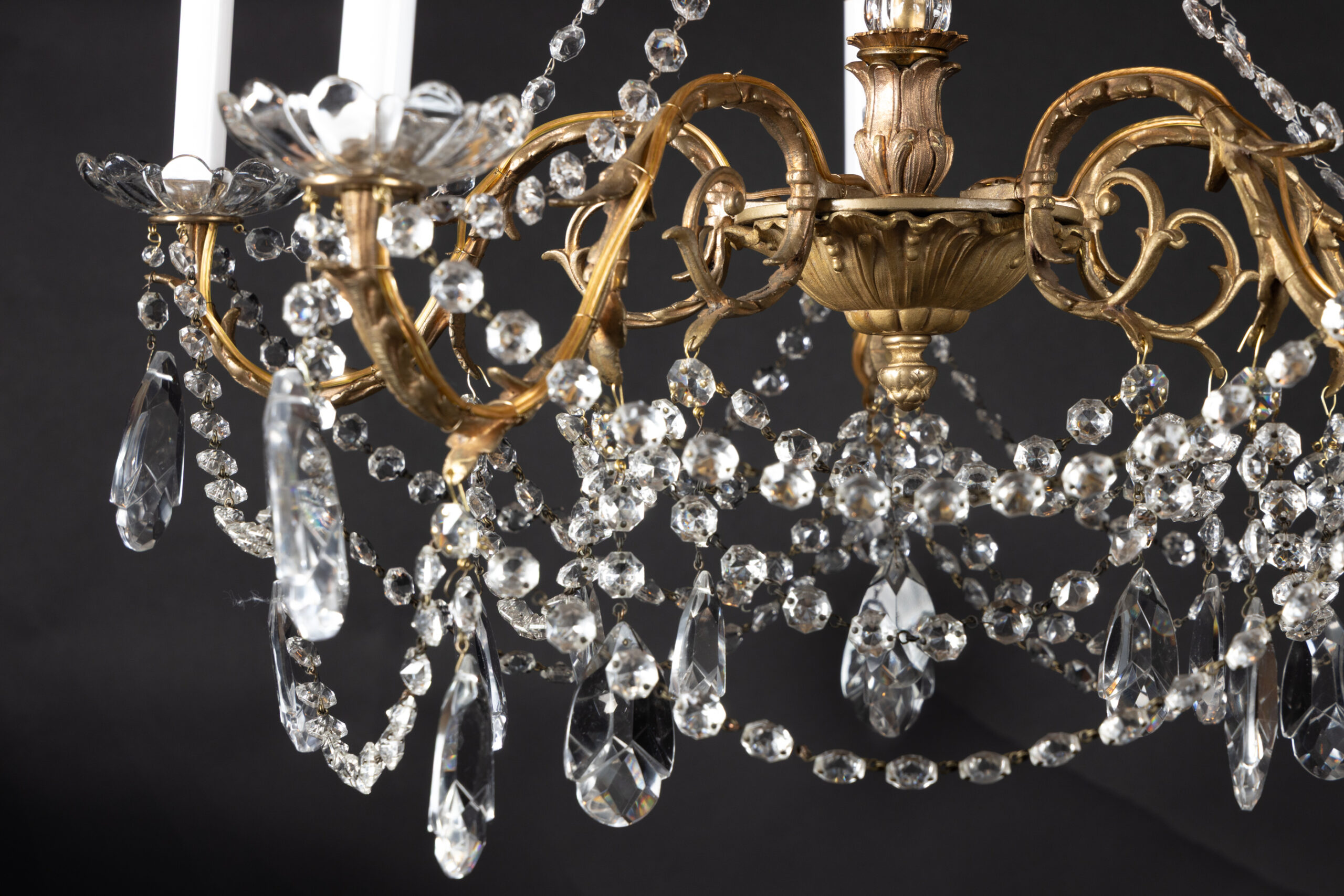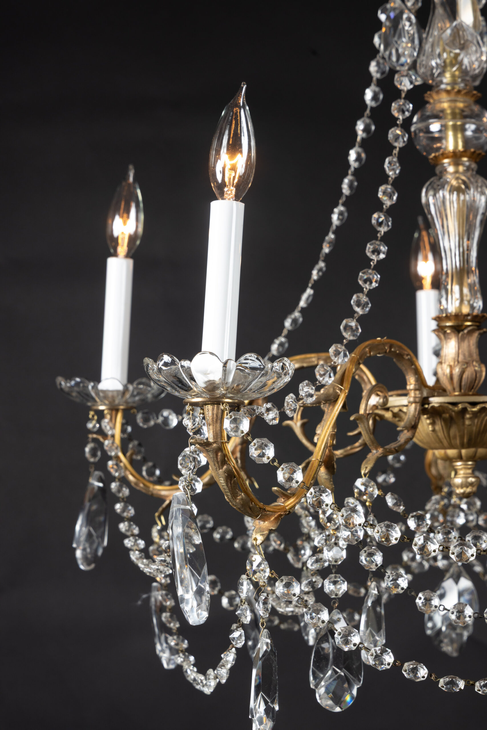 Featuring a fine French 19th century Louis XVI bronze chandelier with bronze cups and drippers. The chandelier features a detailed crown at top followed by crystal spears below. The central stem is surrounded by unique vase shaped crystal elements. Each arm features simple, yet detailed curving elements and is finished with fine crystal bobeches under each of the five lights. The chandelier is draped with crystal beads and beautiful plaquettes at bottom. Each of these elements combines to make a uniquely French light fixture, poised to bring a French charm to any interior design and to be a focal point of any room in which it is found.Â