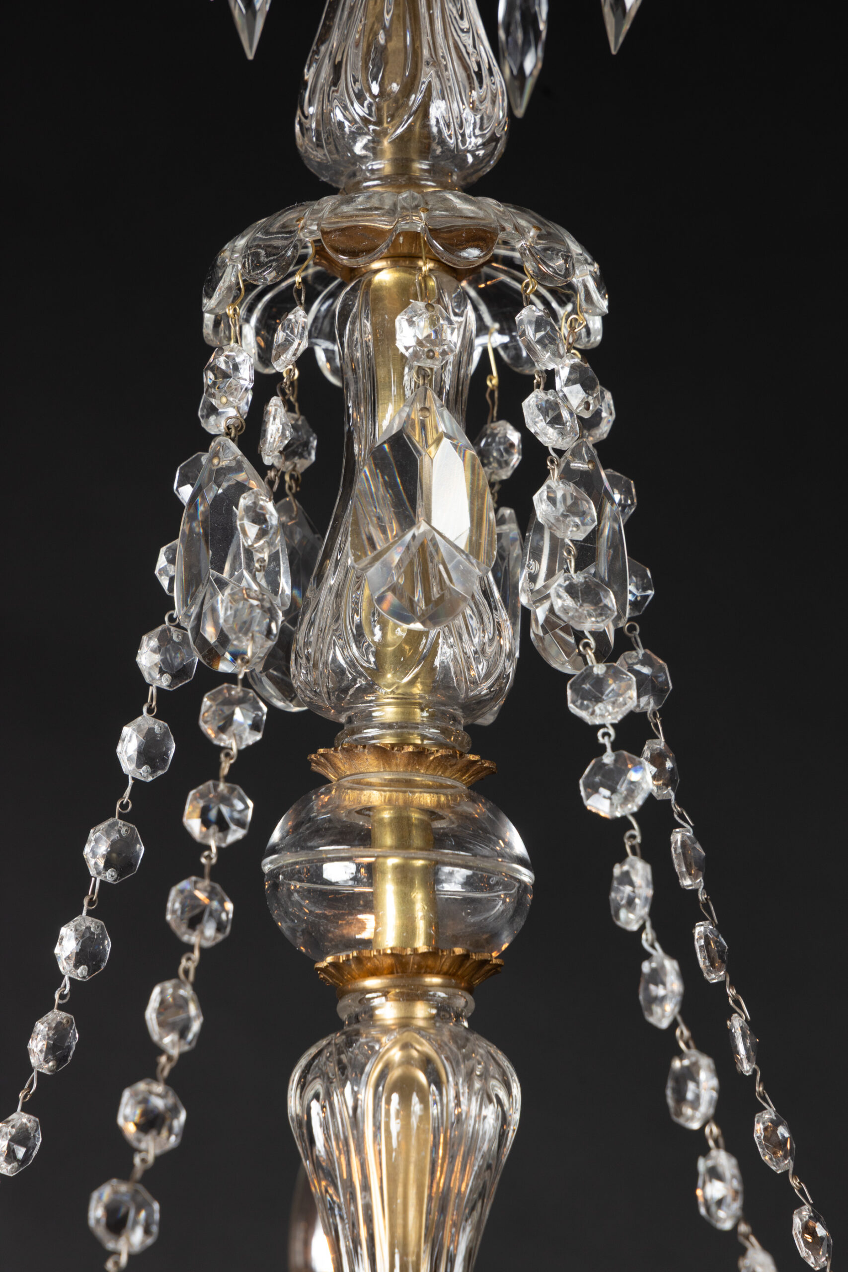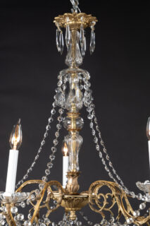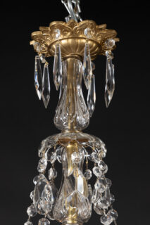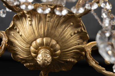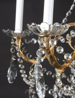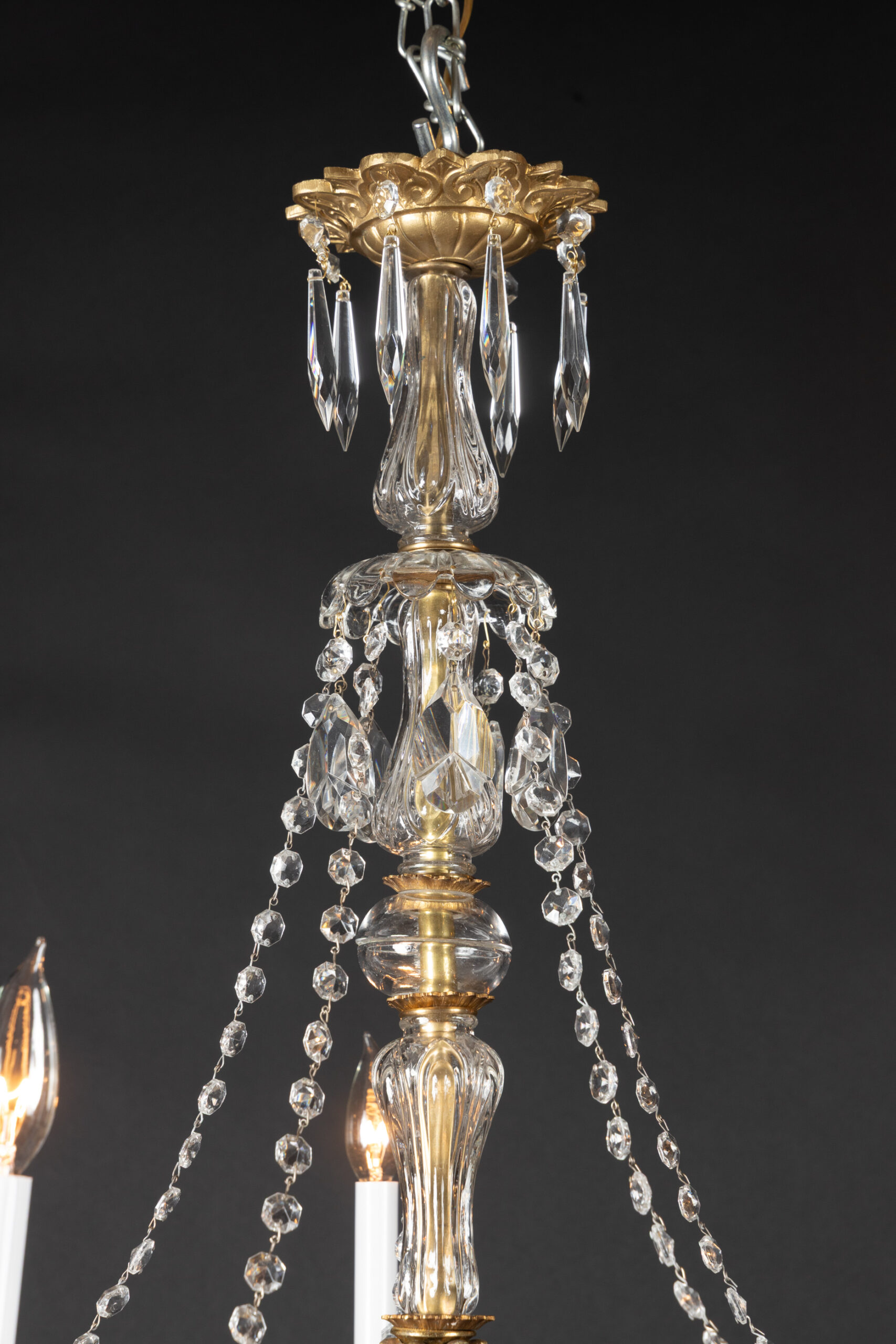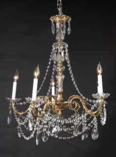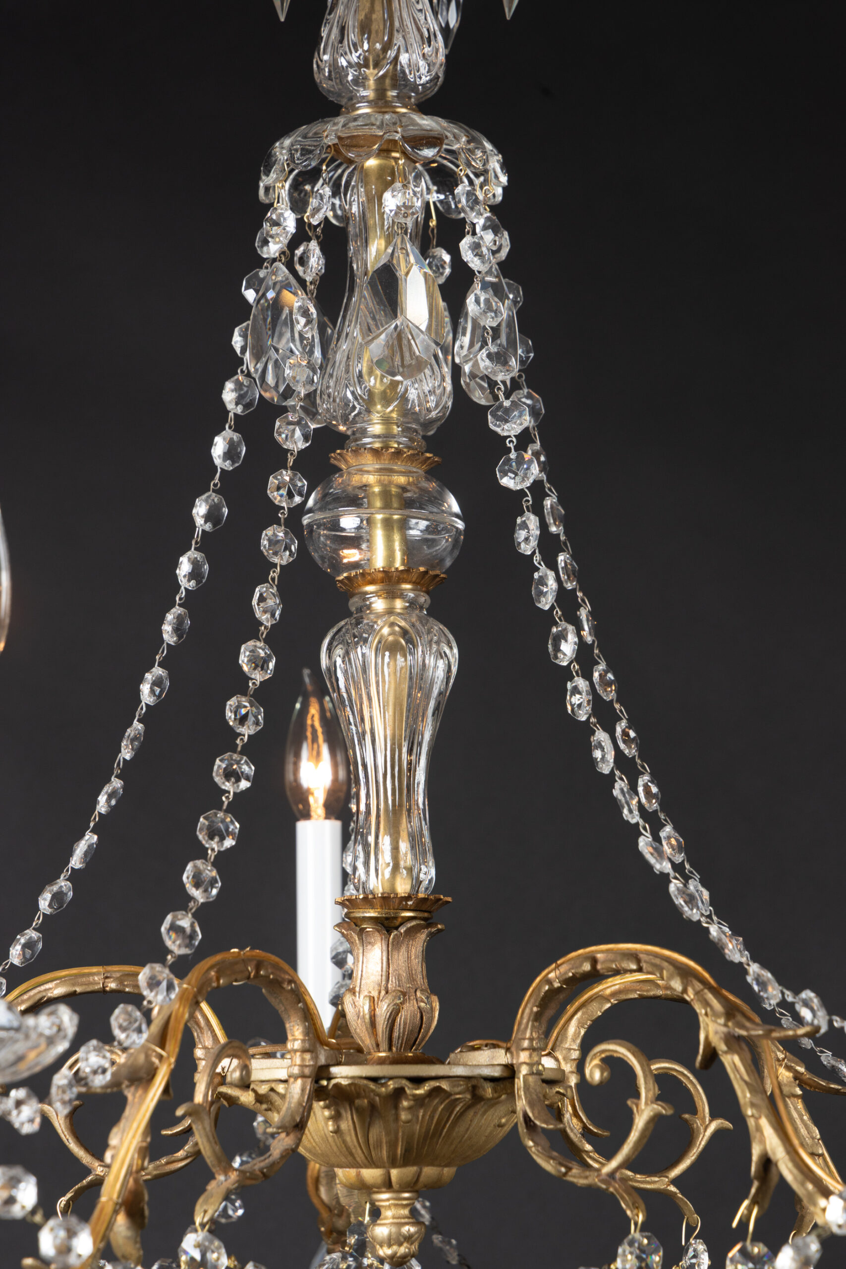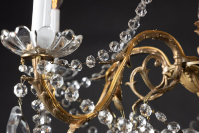Featuring a fine French 19th century Louis XVI bronze chandelier with bronze cups and drippers. The chandelier features a detailed crown at top followed by crystal spears below. The central stem is surrounded by unique vase shaped crystal elements. Each arm features simple, yet detailed curving elements and is finished with fine crystal bobeches under each of the five lights. The chandelier is draped with crystal beads and beautiful plaquettes at bottom. Each of these elements combines to make a uniquely French light fixture, poised to bring a French charm to any interior design and to be a focal point of any room in which it is found.Â