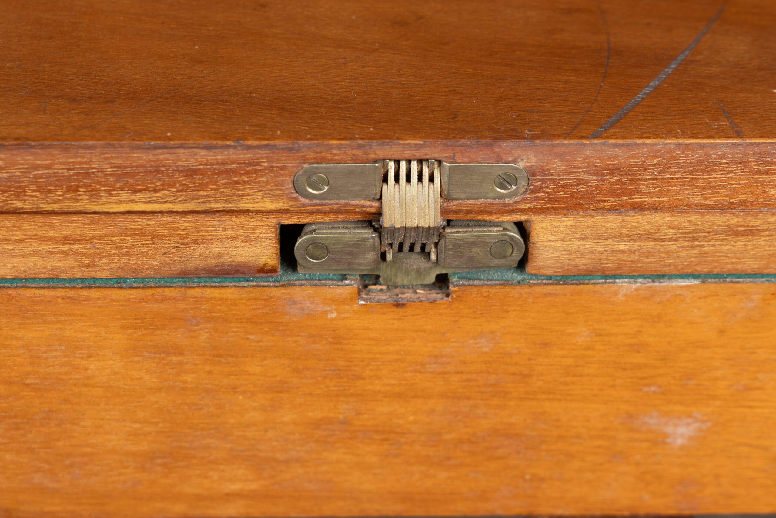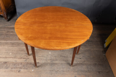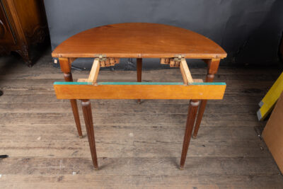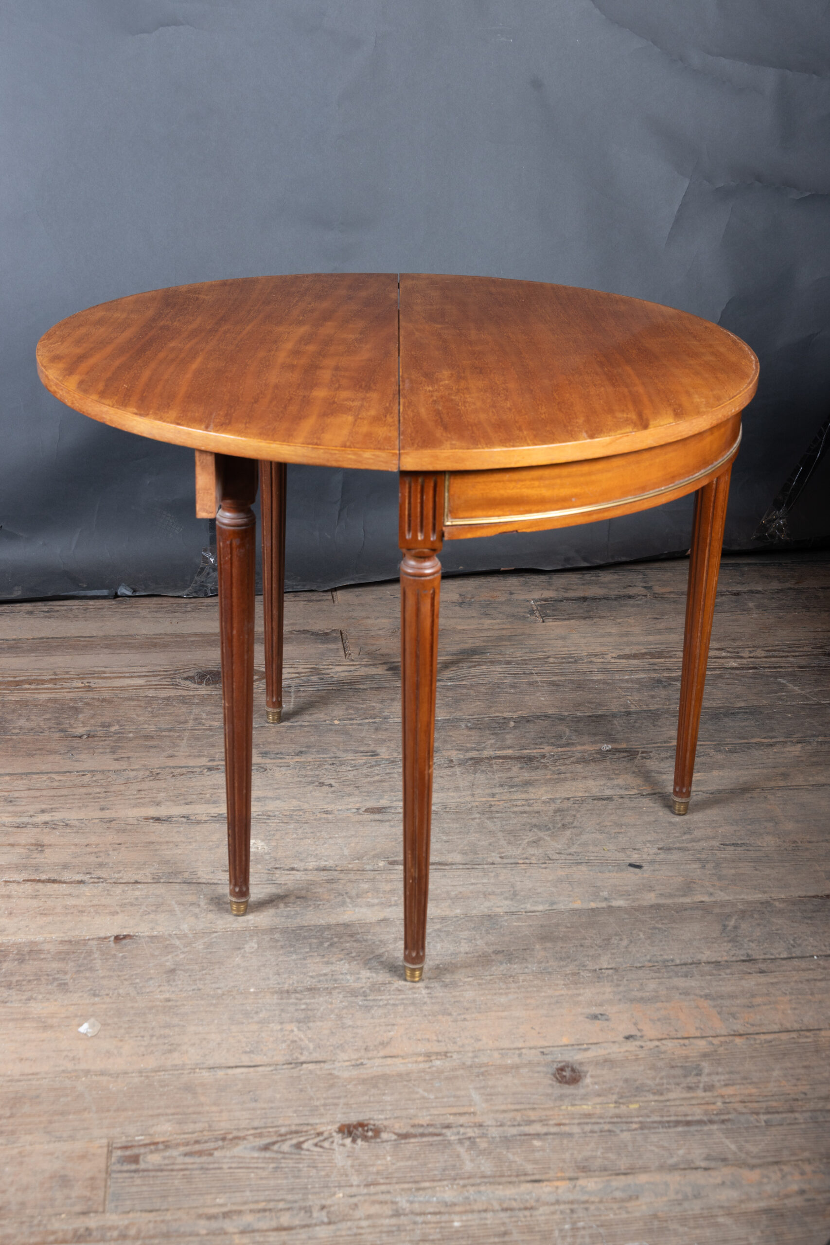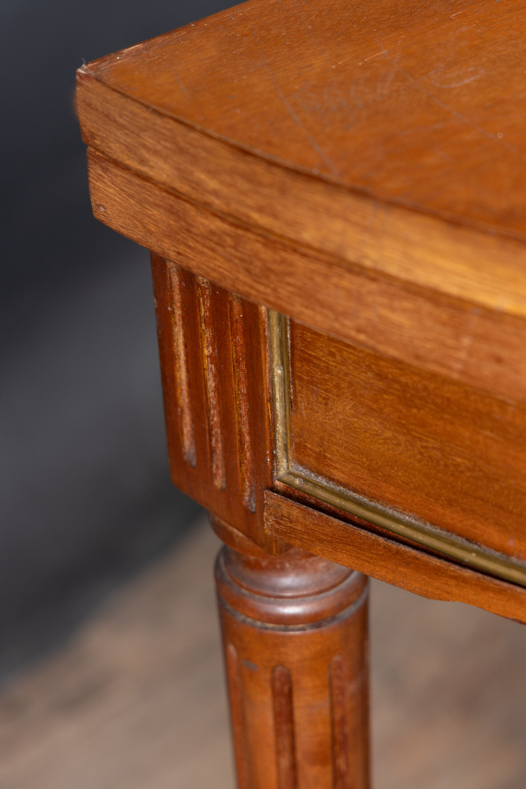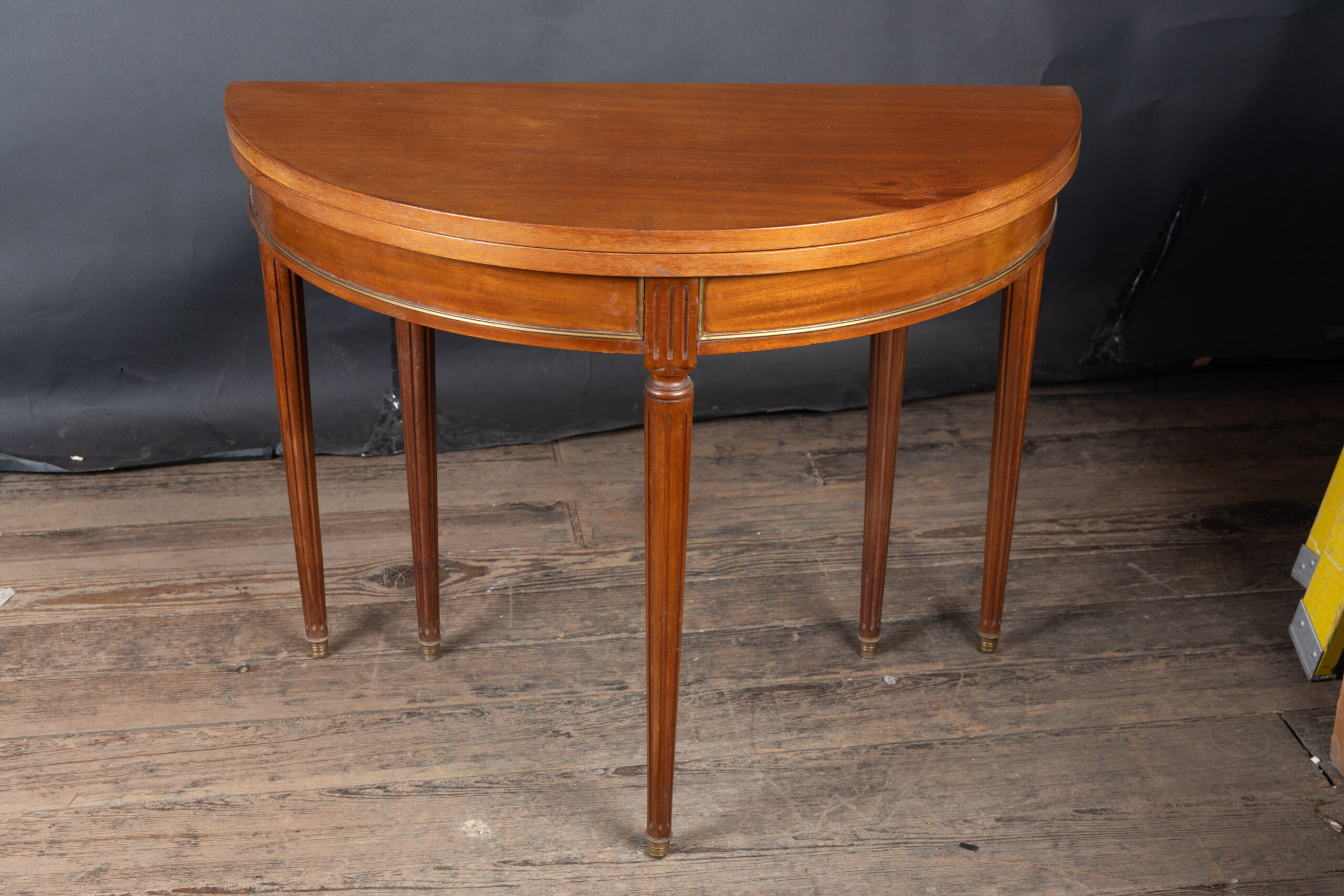 French 19th century Louis XVI fruitwood demi-lune card table with fluted legs. The piece features beautiful and simple bronze inlays along the apron and bronze feet at the base of each leg. The piece features legs which shift to the back to offer further support for the table top when opened.