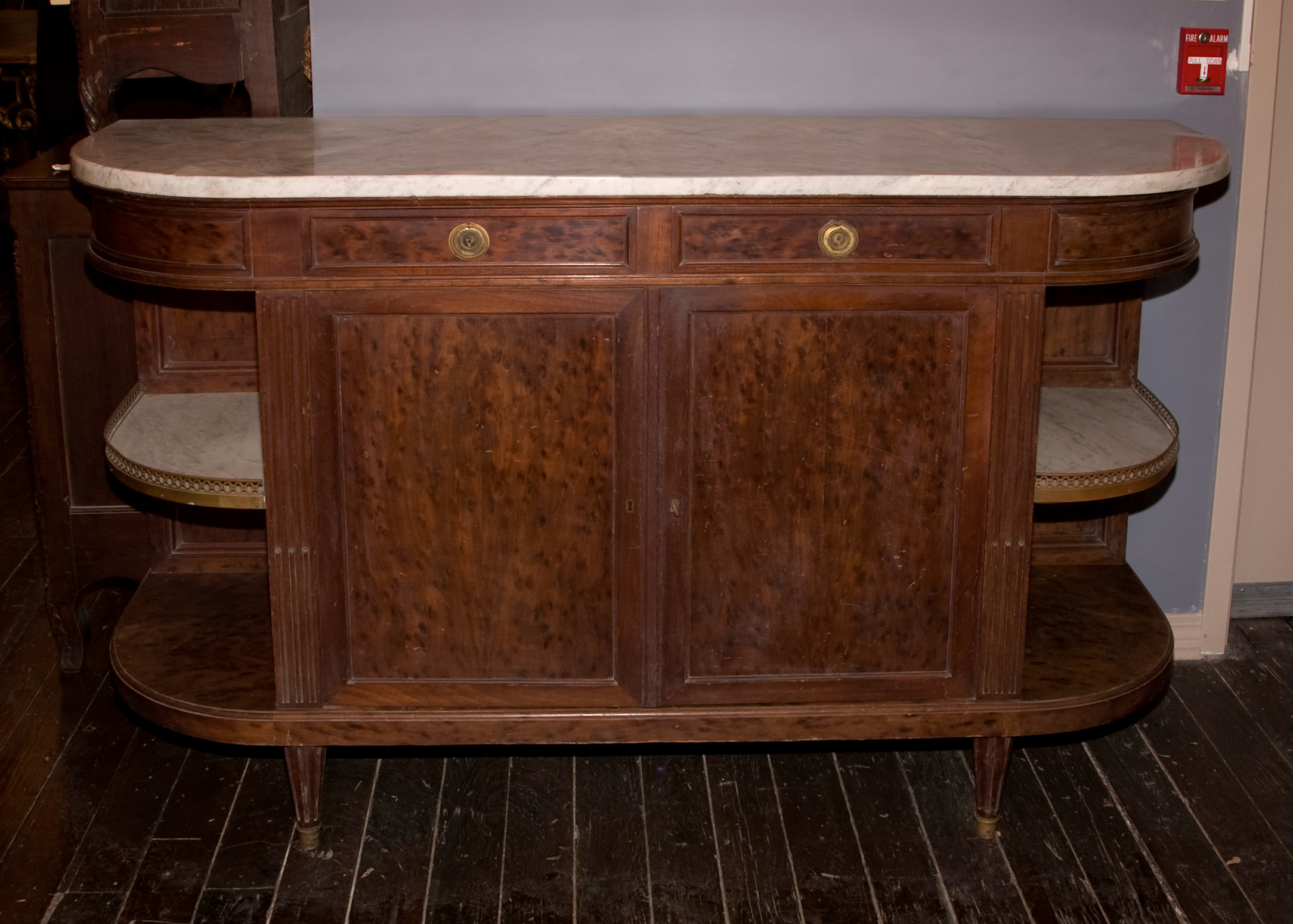 French 19th century Louis XVI marble top buffet with two doors, two drawers and open side shelves