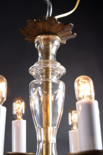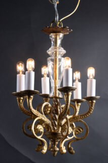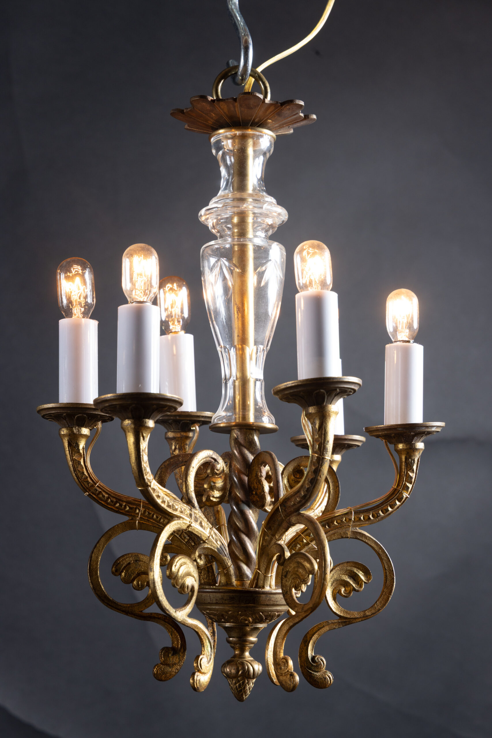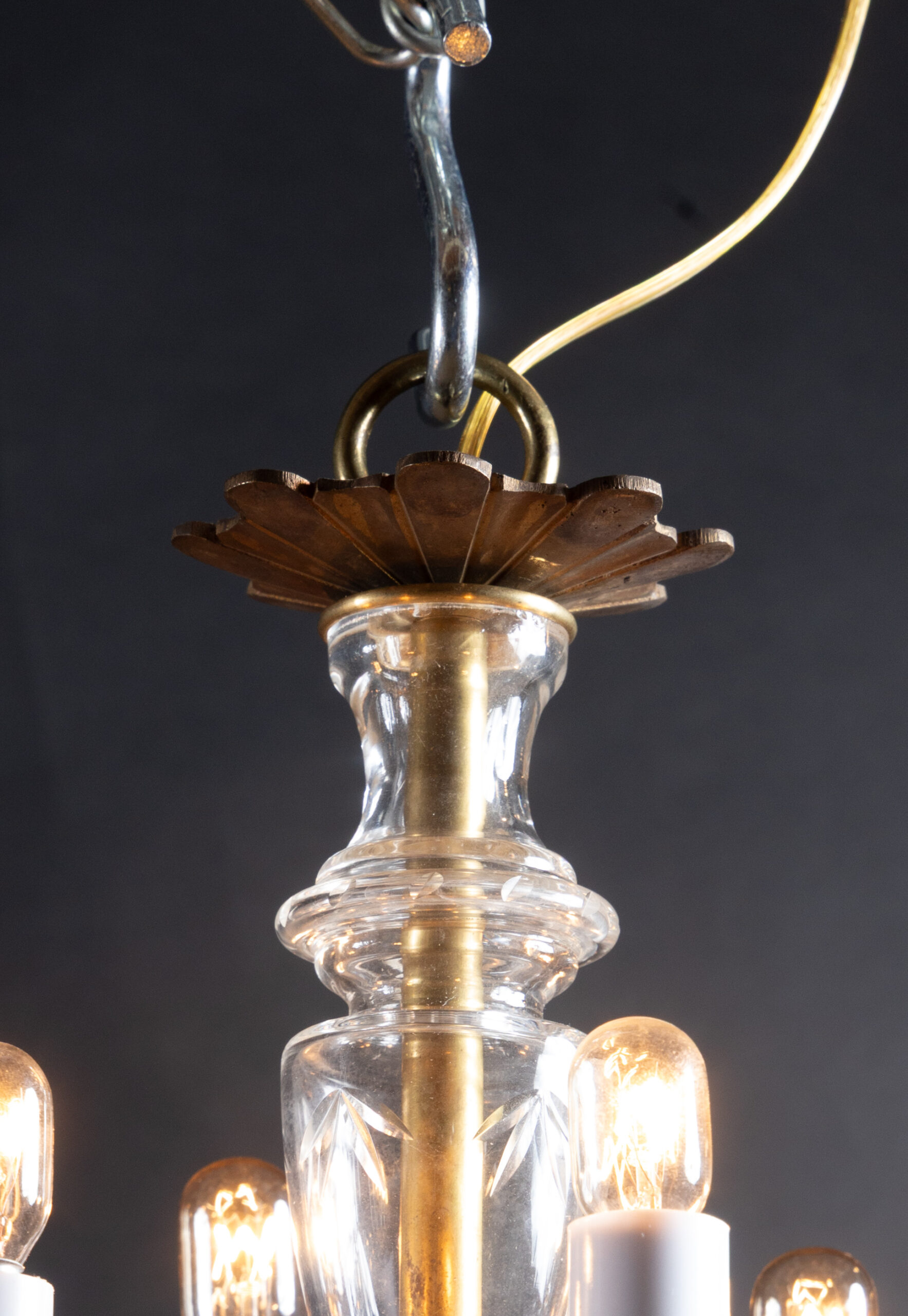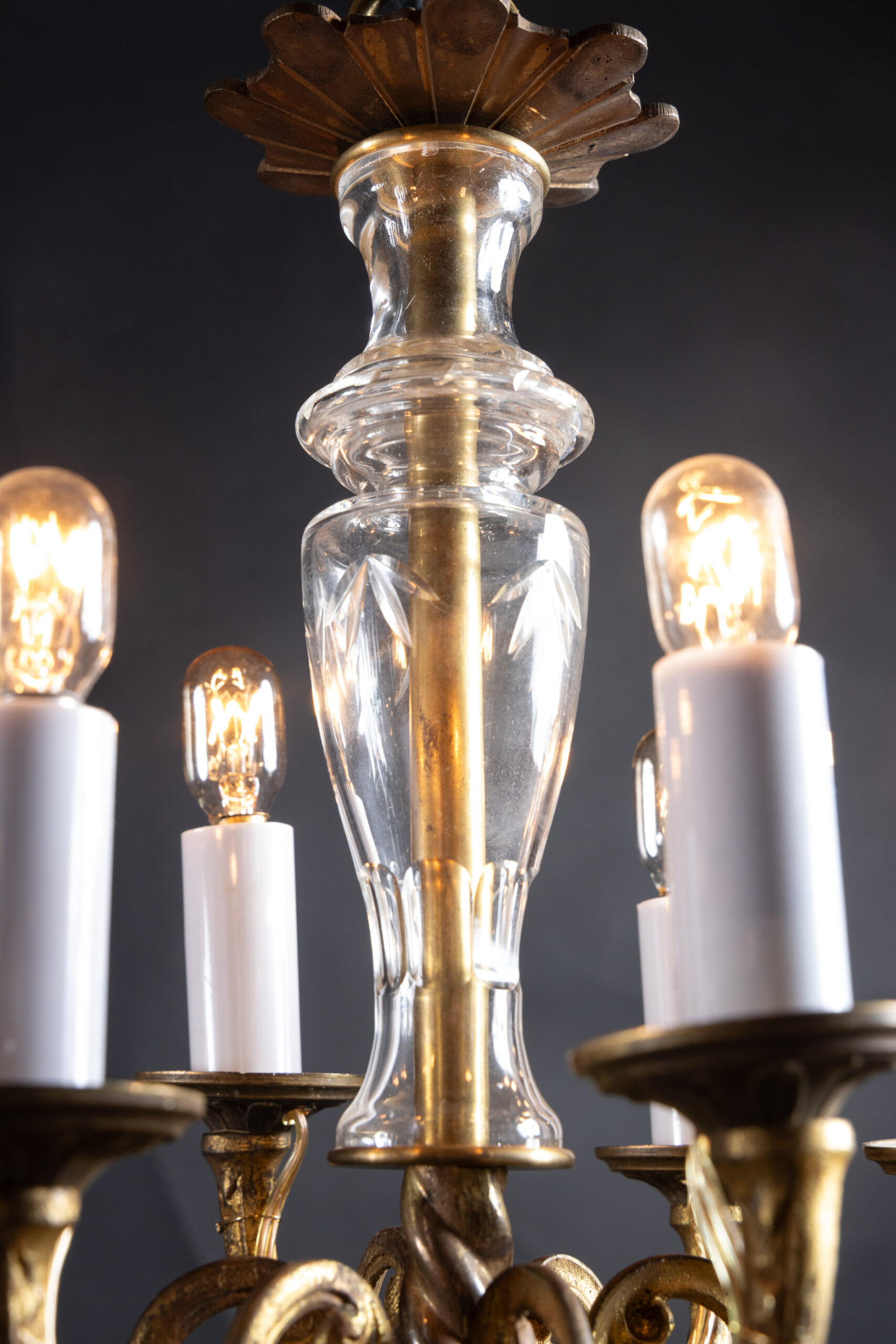 A beautiful pair of small, stately Louis XVI chandeliers. The pair dates back to the 19th century and sports a delightful etched crystal center stem. Below rests a spiraling bronze stem, surrounded by six classically curved Louis XVI arms. The crown features a sunburst patterned crown, and the bottom hosts an acorn finial. Diagonal patterns can be found under the simple bobeches, with swirling elements underneath. The pair is poised to bring a delightful French charm to any room.