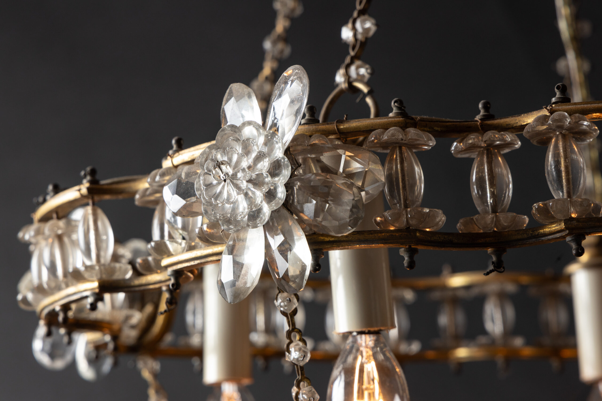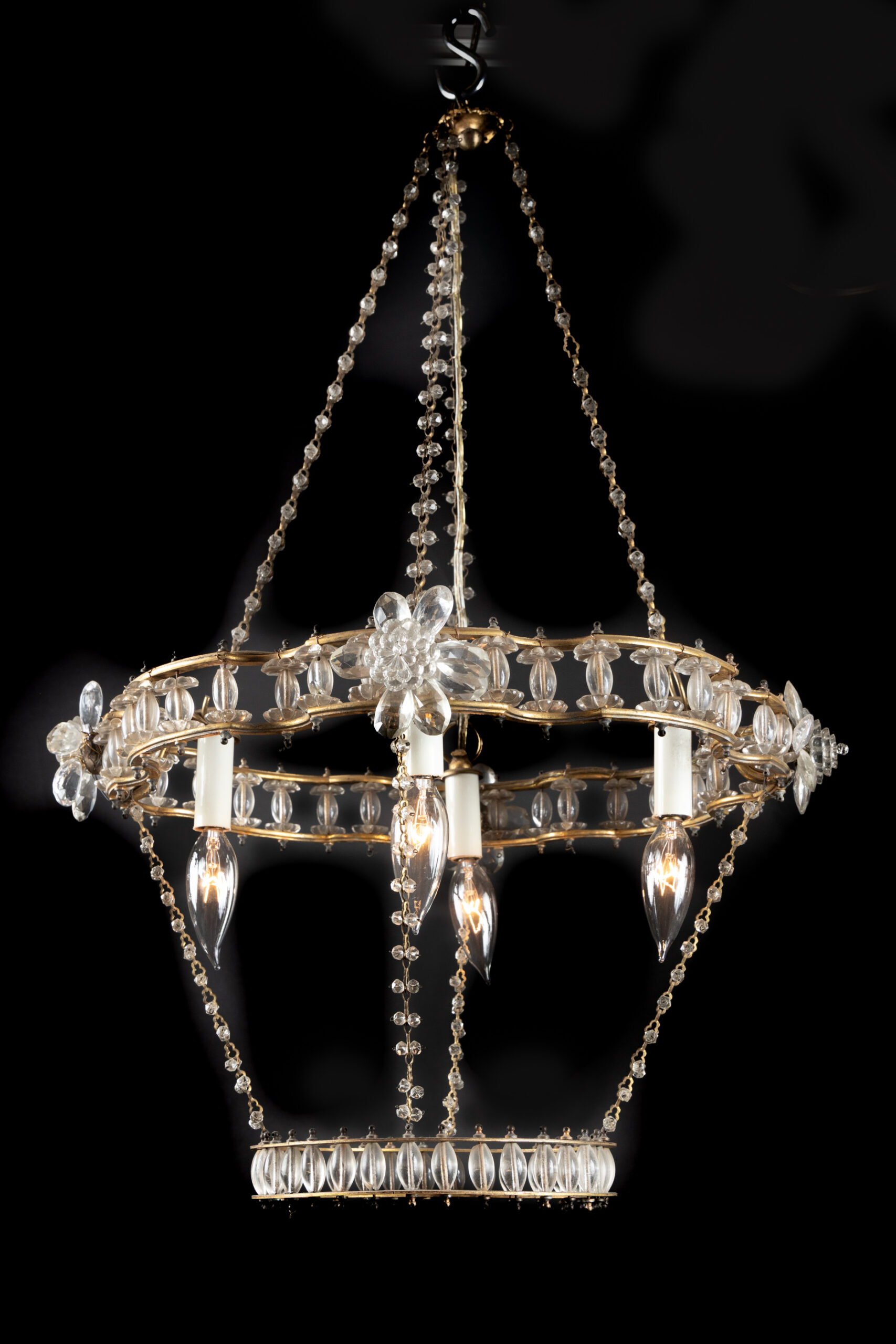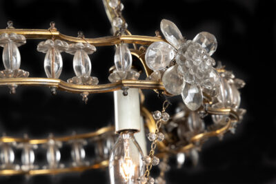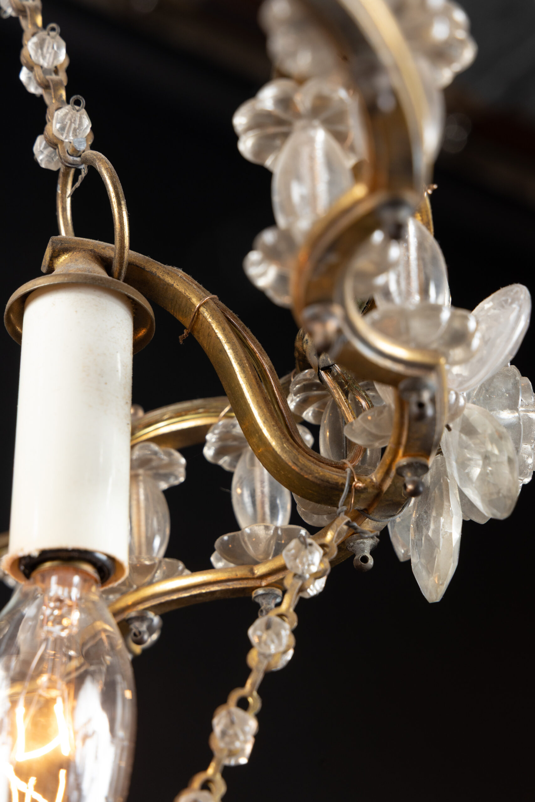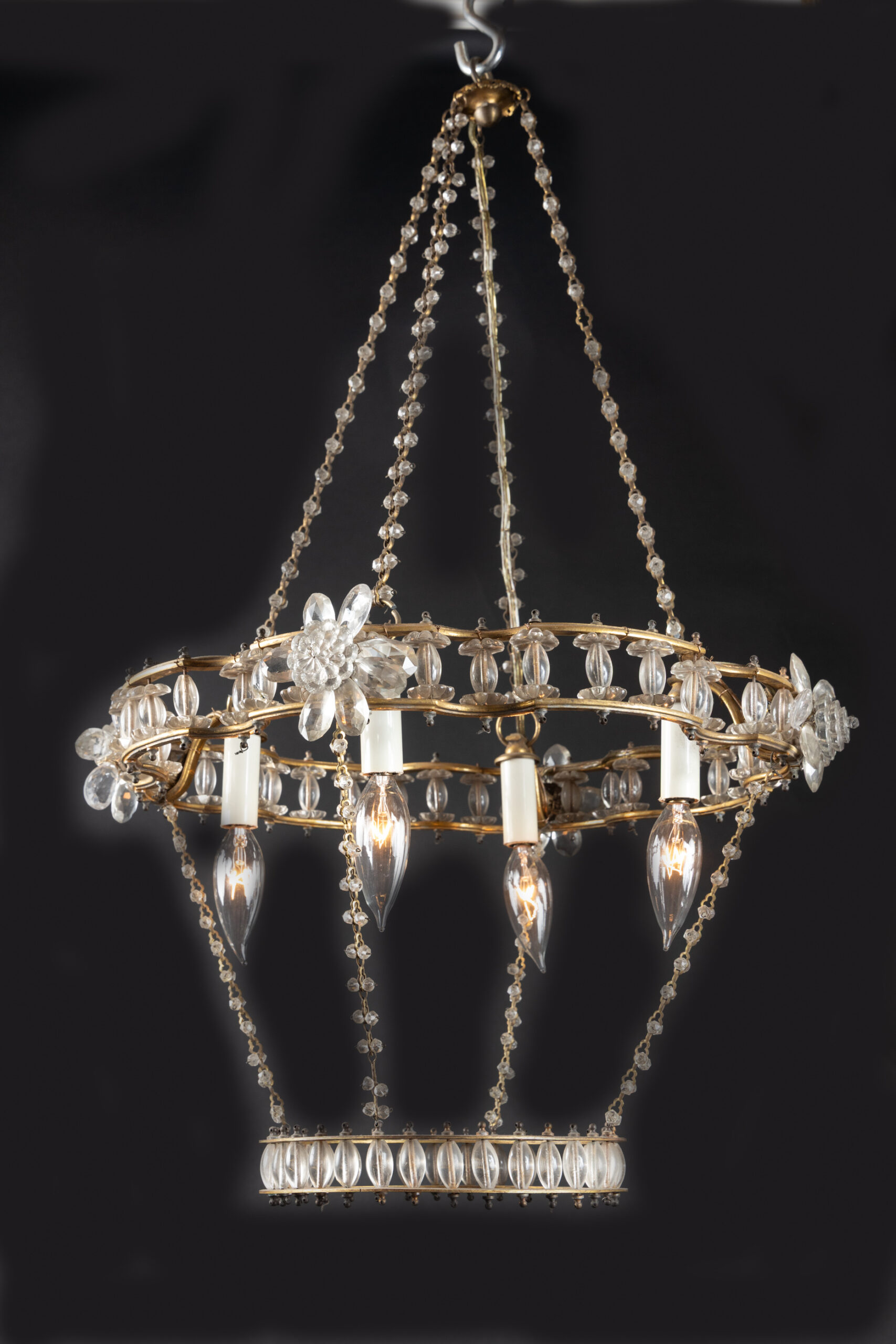 French Early 20th century Louis XVI unusual and whimsical bronze & crystal chandelier. The chandelier features 4 lights pointing down to show the novelty of the electric light used when it was created. The piece is poised to bring a unique French charm to any room it is found in.