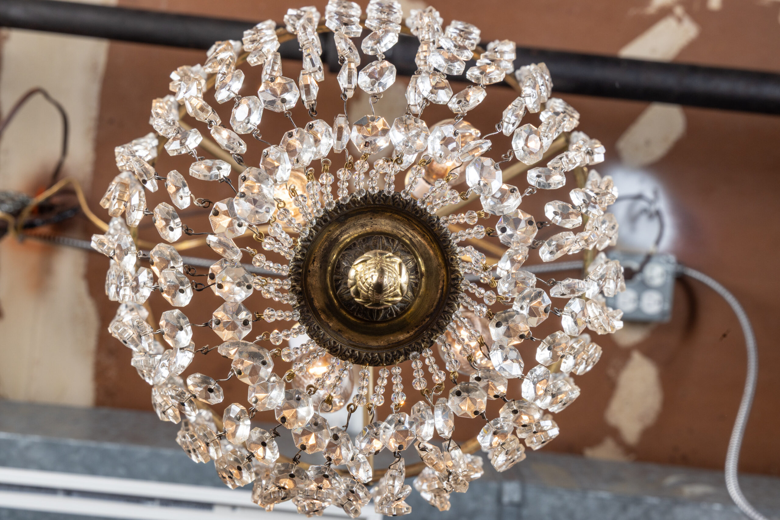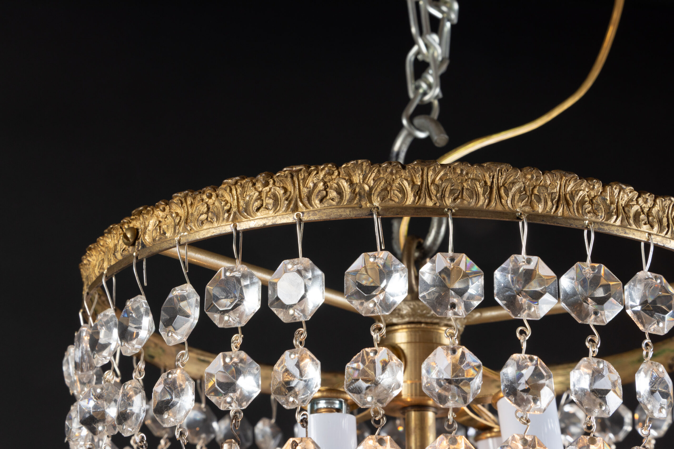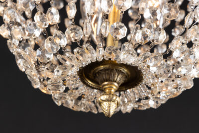 French Late 19th Century Bronze and Crystal Plafonnier with a beautifully detailed bronze crown. The piece features octagonal crystals meeting at a simple acorn finial at bottom.