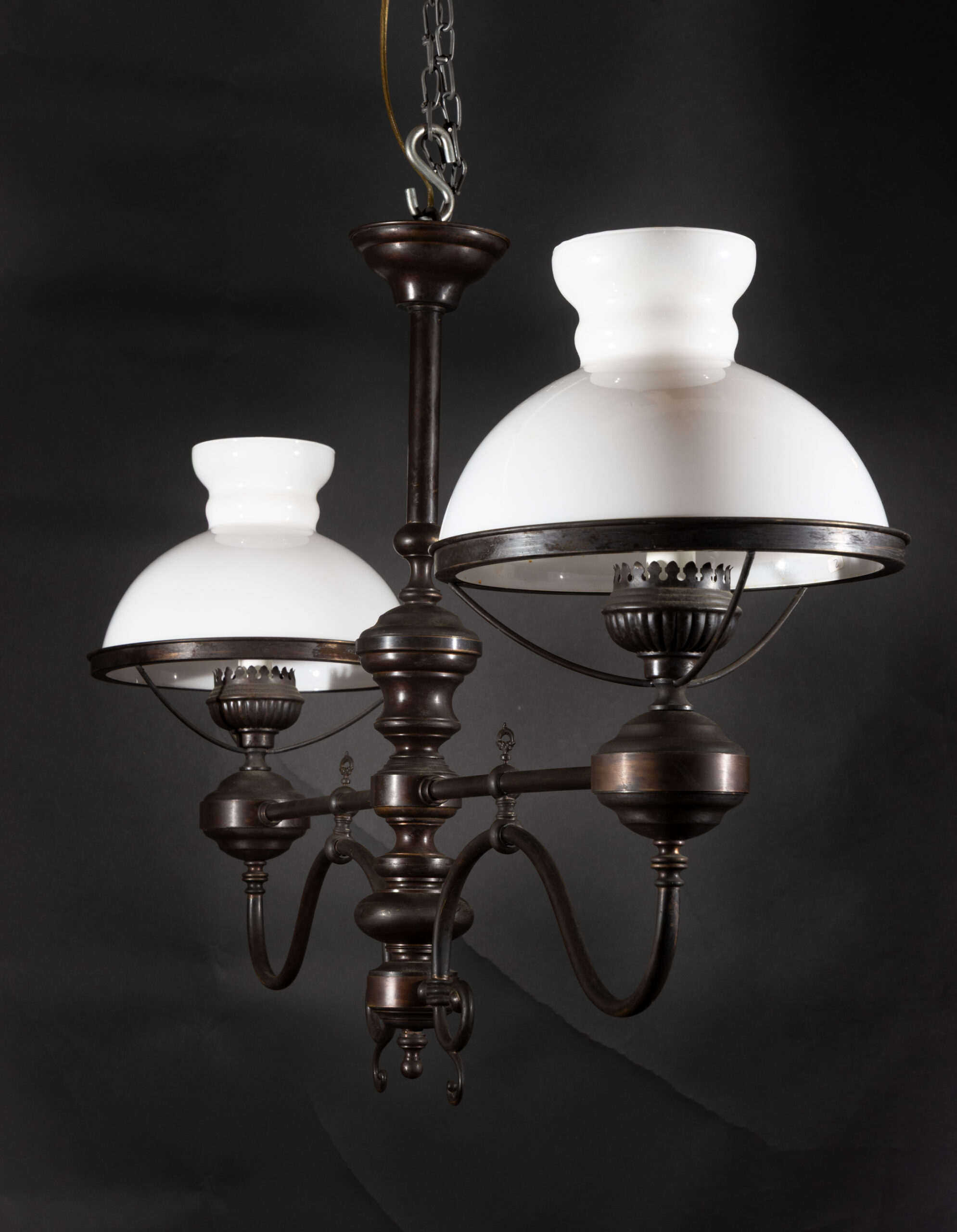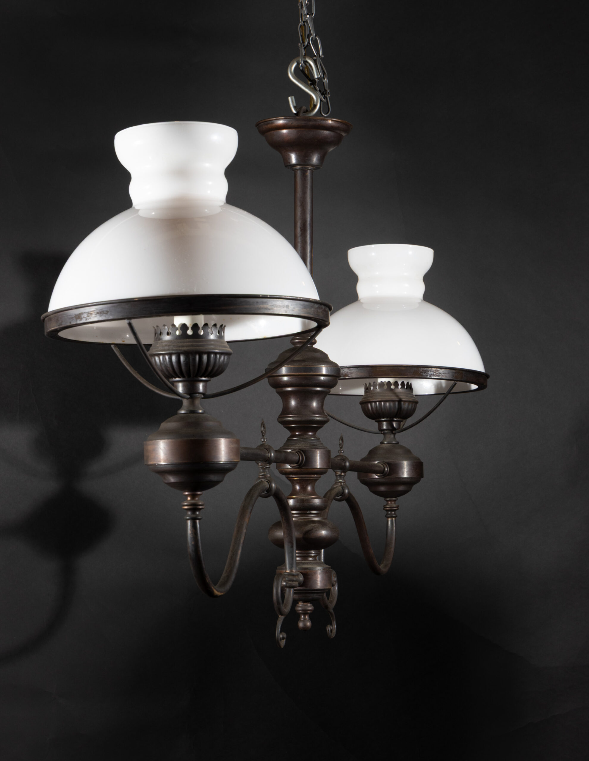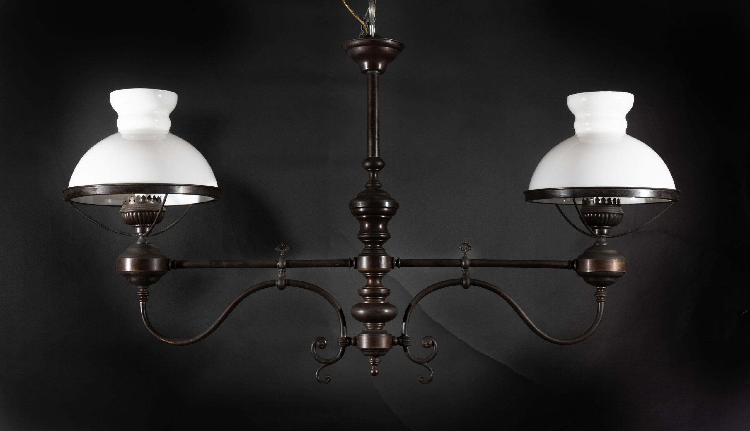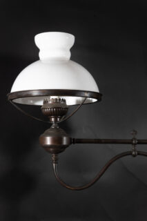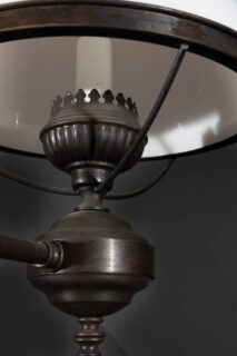 Italian early 20th century oscuro brass billiard lights with satin globes and glass chimney and key for glass on each light.