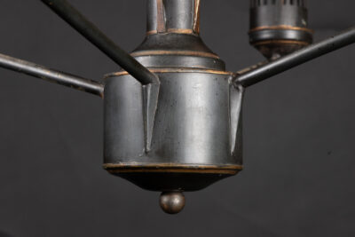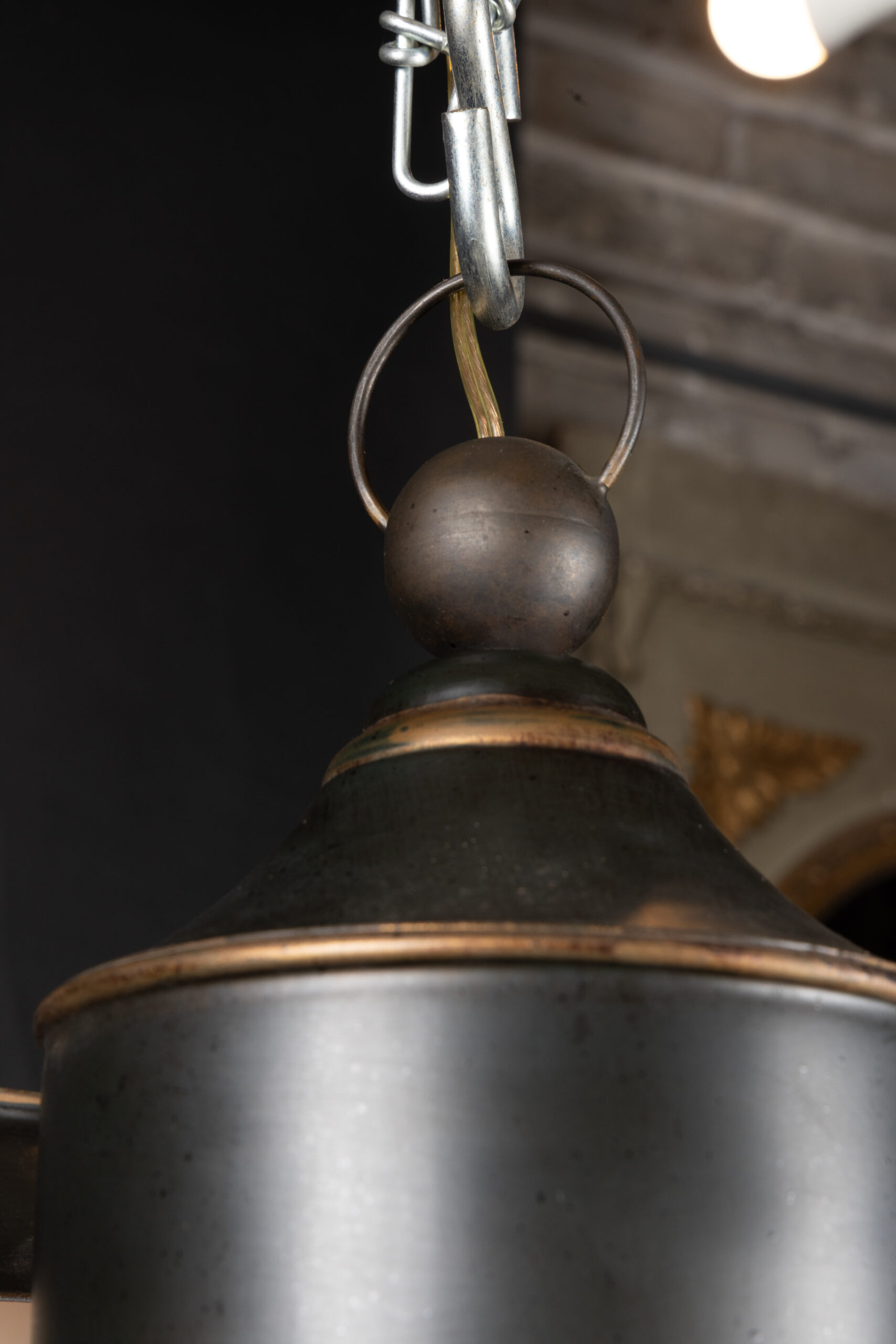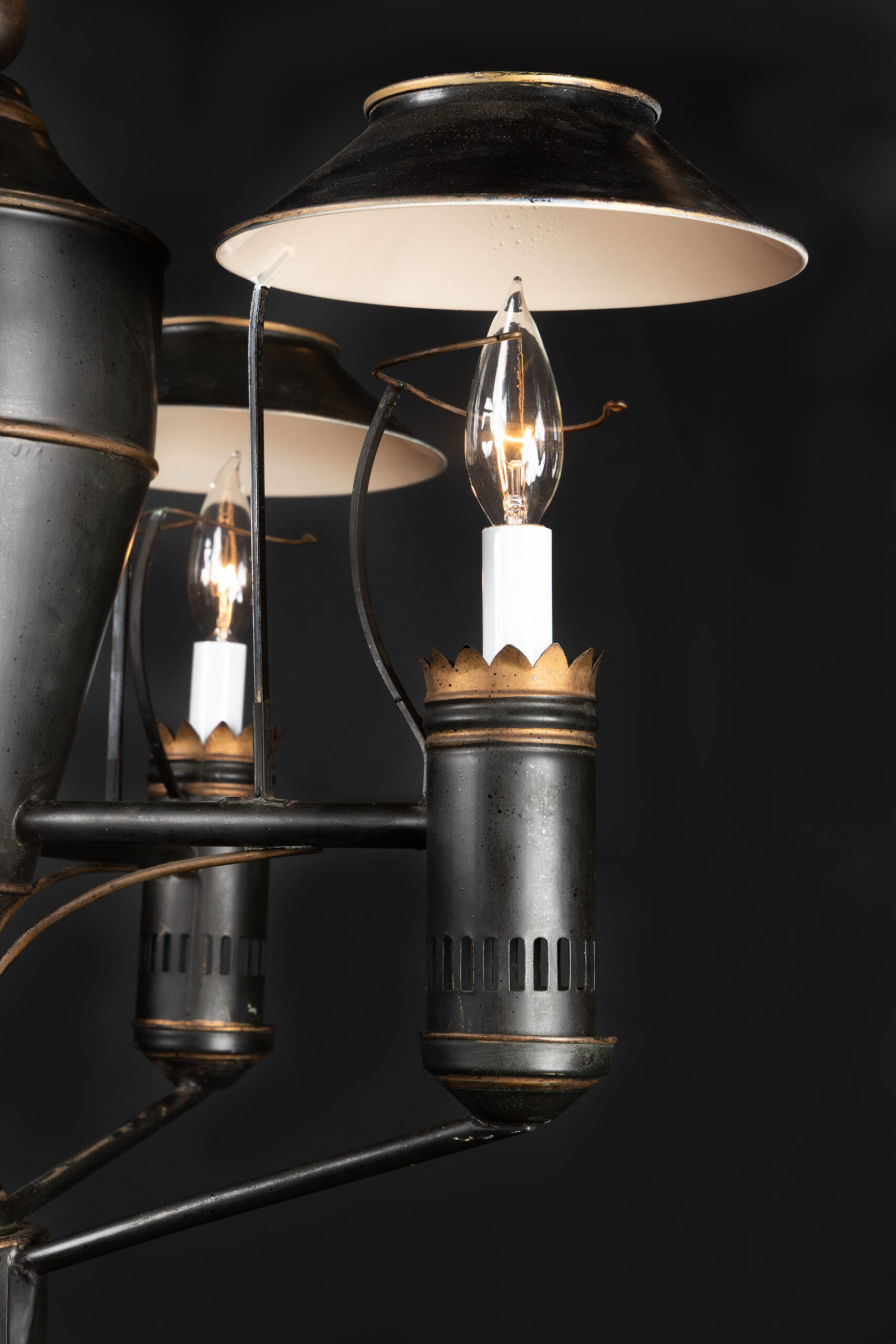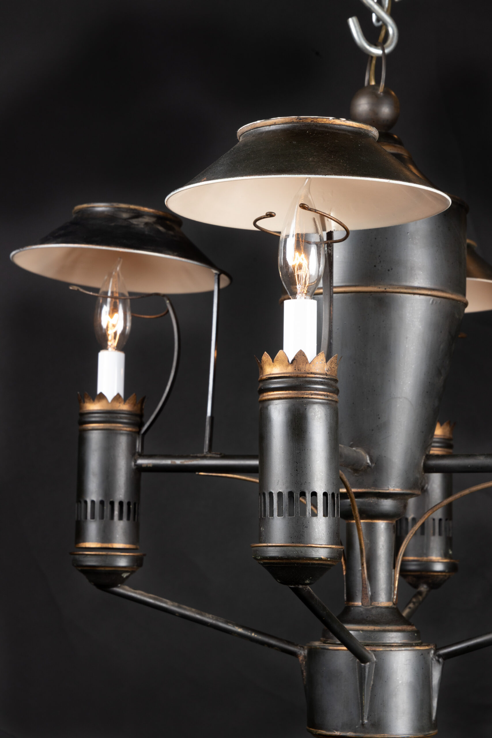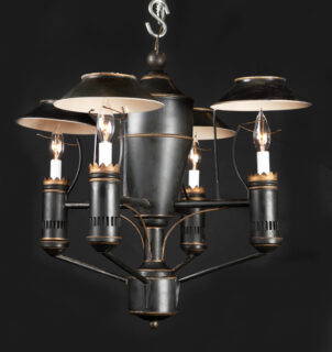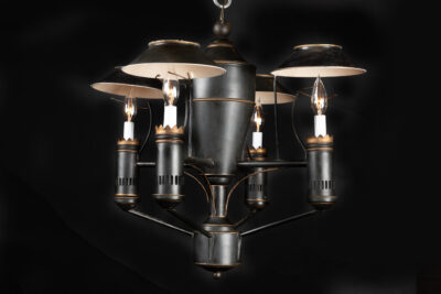 Beautiful Italian mid 20th century black & gold chandelier with attached tole shades. The chandelier features four lights, each supported by pierced tole bobeches. The substantial vase shaped center pairs well with the tole shades. The piece is hand painted a deep black, a fine background for the gold leaf highlights to play off of. The piece is well balanced and ready to bring a provincial ambience to any room in which it is found.