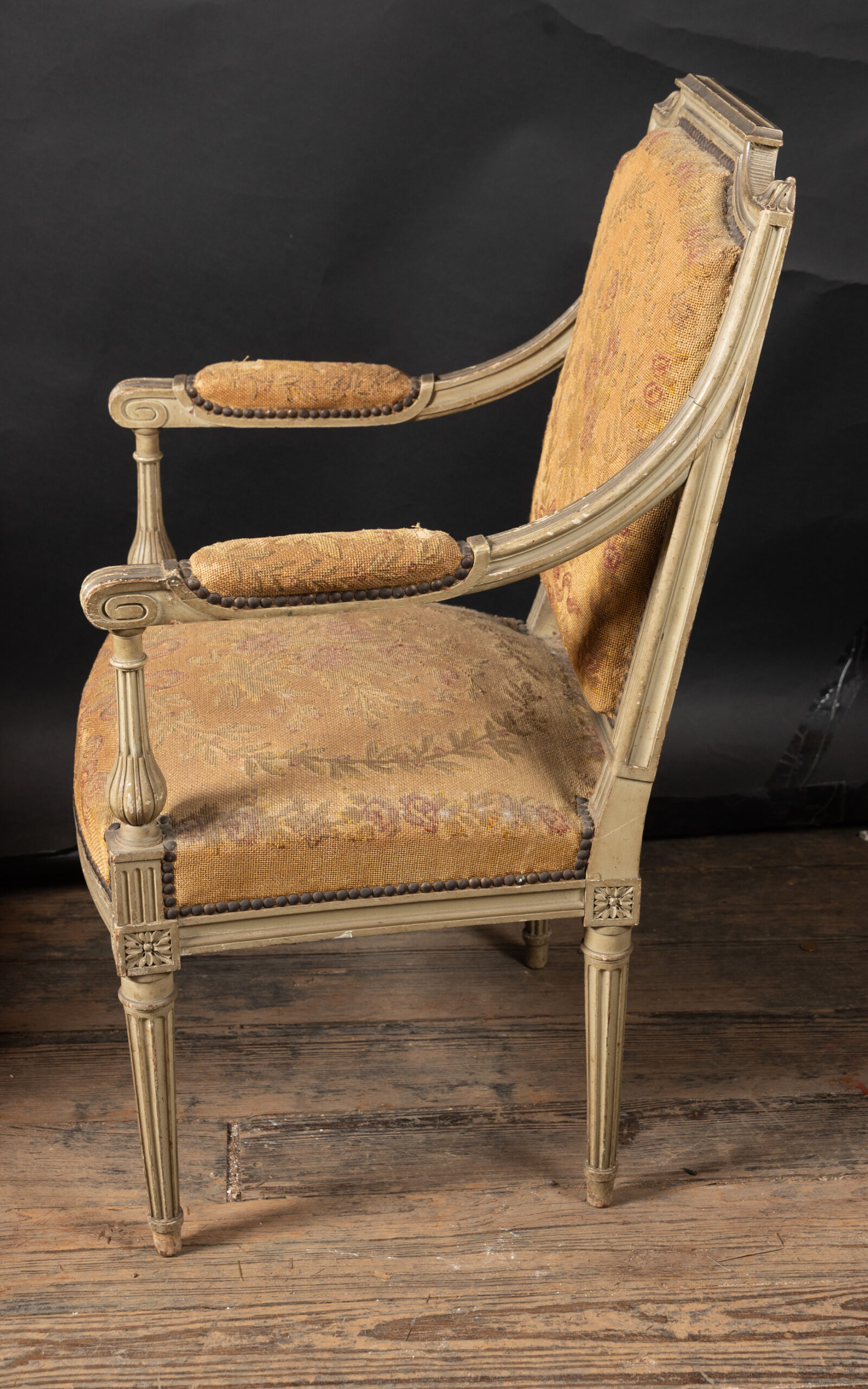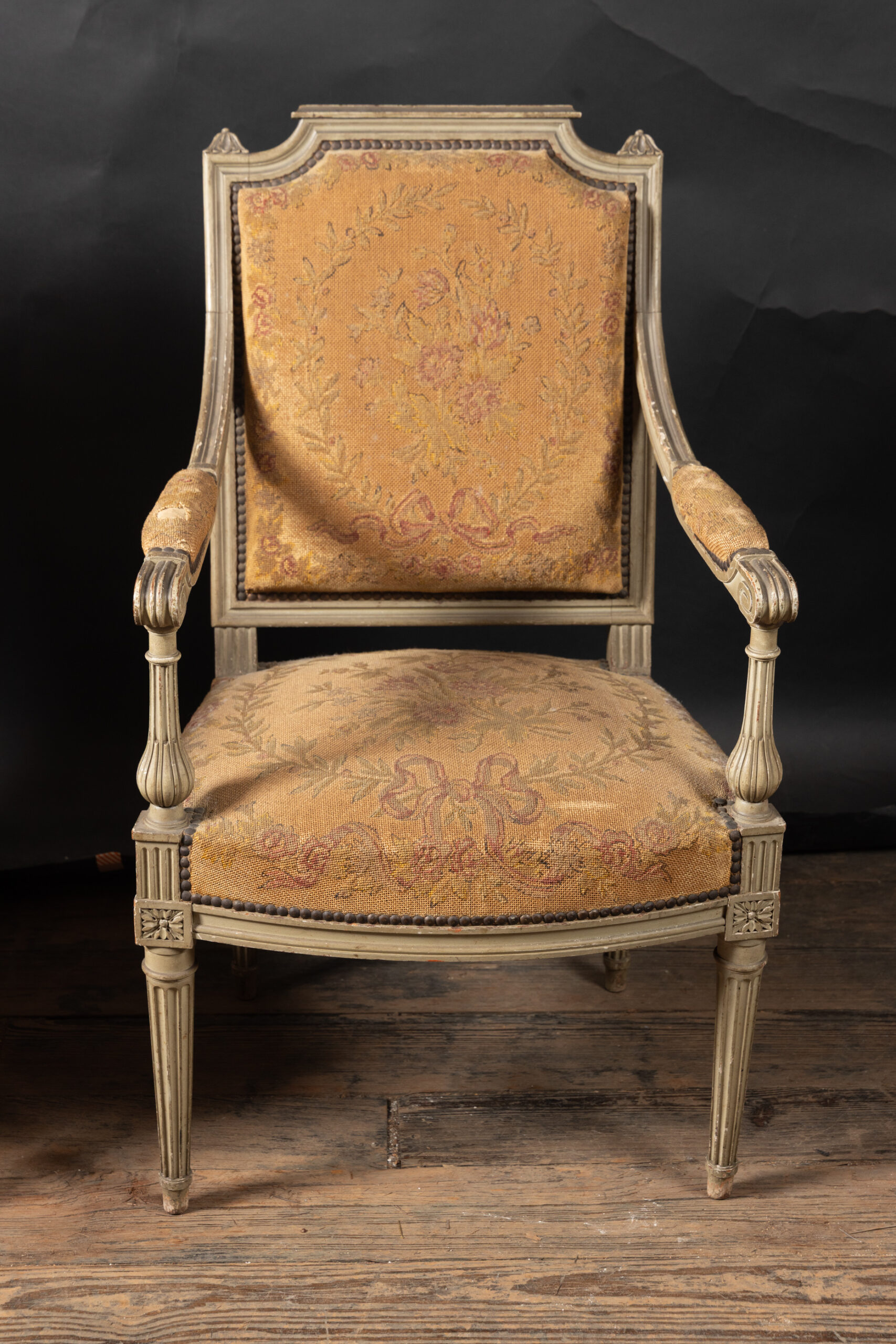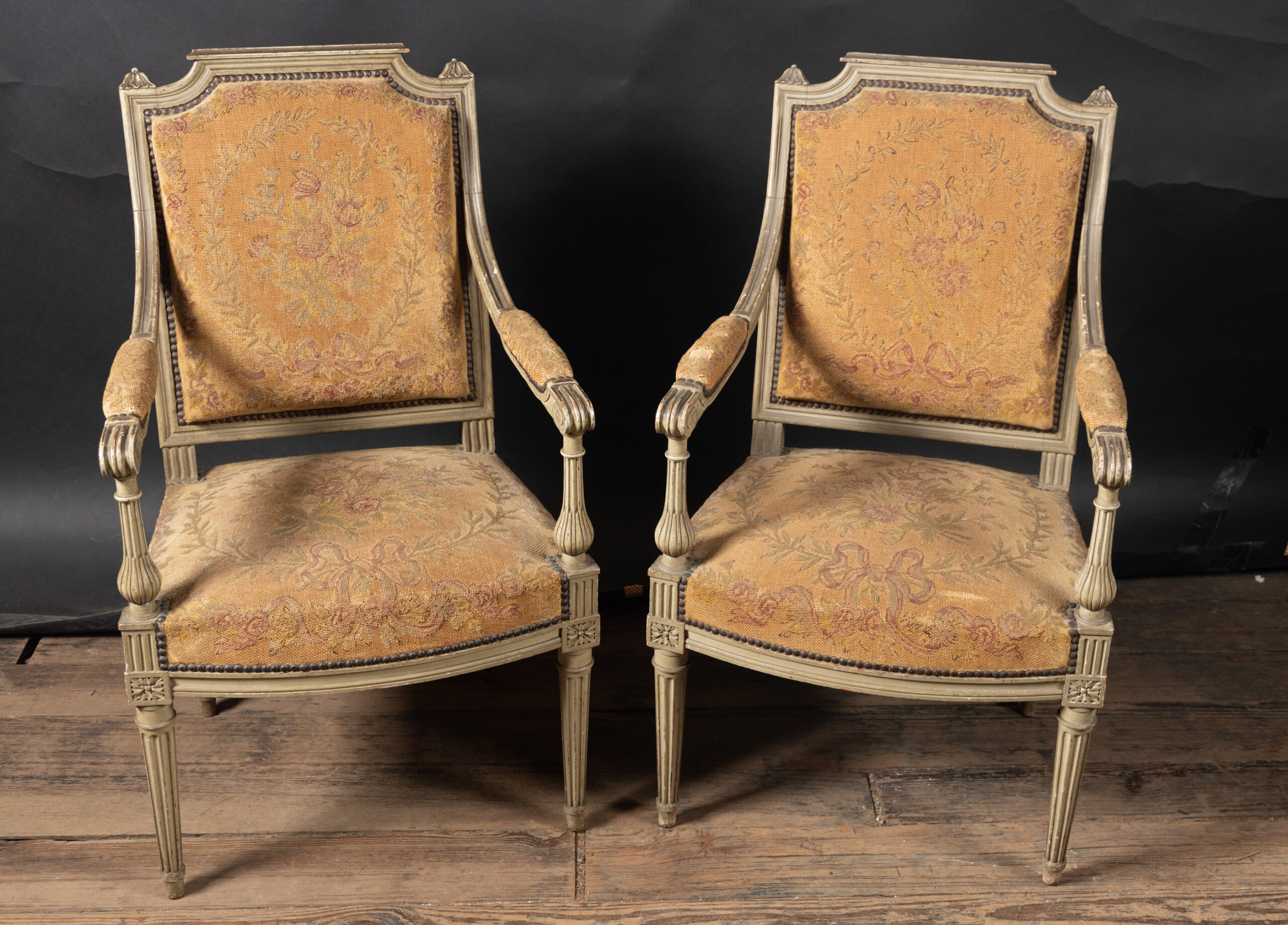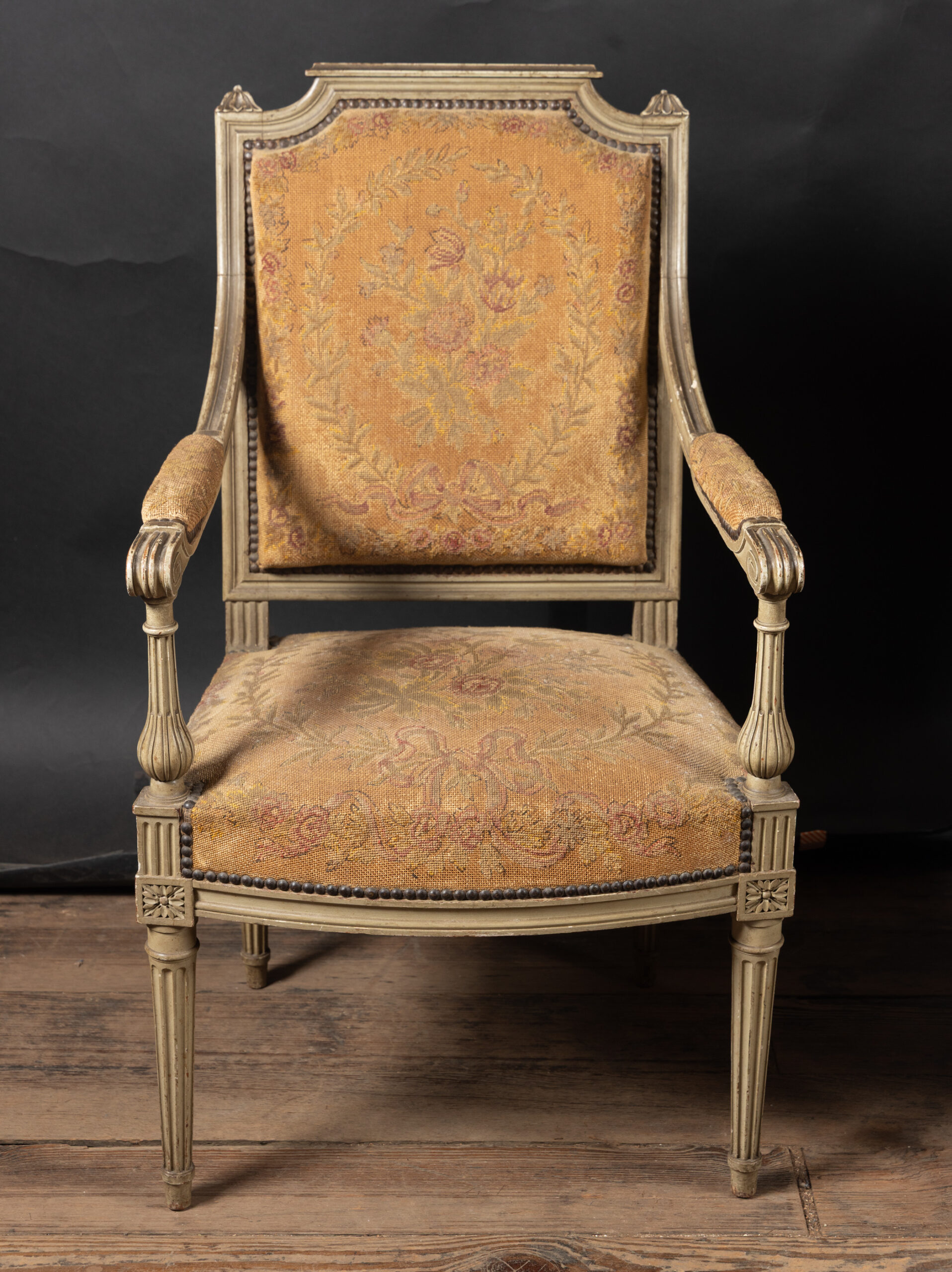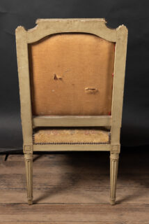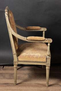 Showcasing an elegant pair of painted French fauteuil armchairs in the grand Louis XVI style with classical frames upholstered in beautiful tapestry. The chairs date back to the 19th century and feature square backs with fluted elements and marguerites at the top of each corner, classic to the timeless Louis XVI style. The arms end in fine curved scrolls and play host to padded elements with the same tapestry. The pair finishes on tapered, fluted legs and rests on small feet. Each element combines with the unique patina to yield a fine example of the Louis XVI style, poised to bring a French charm to any interior design.Â