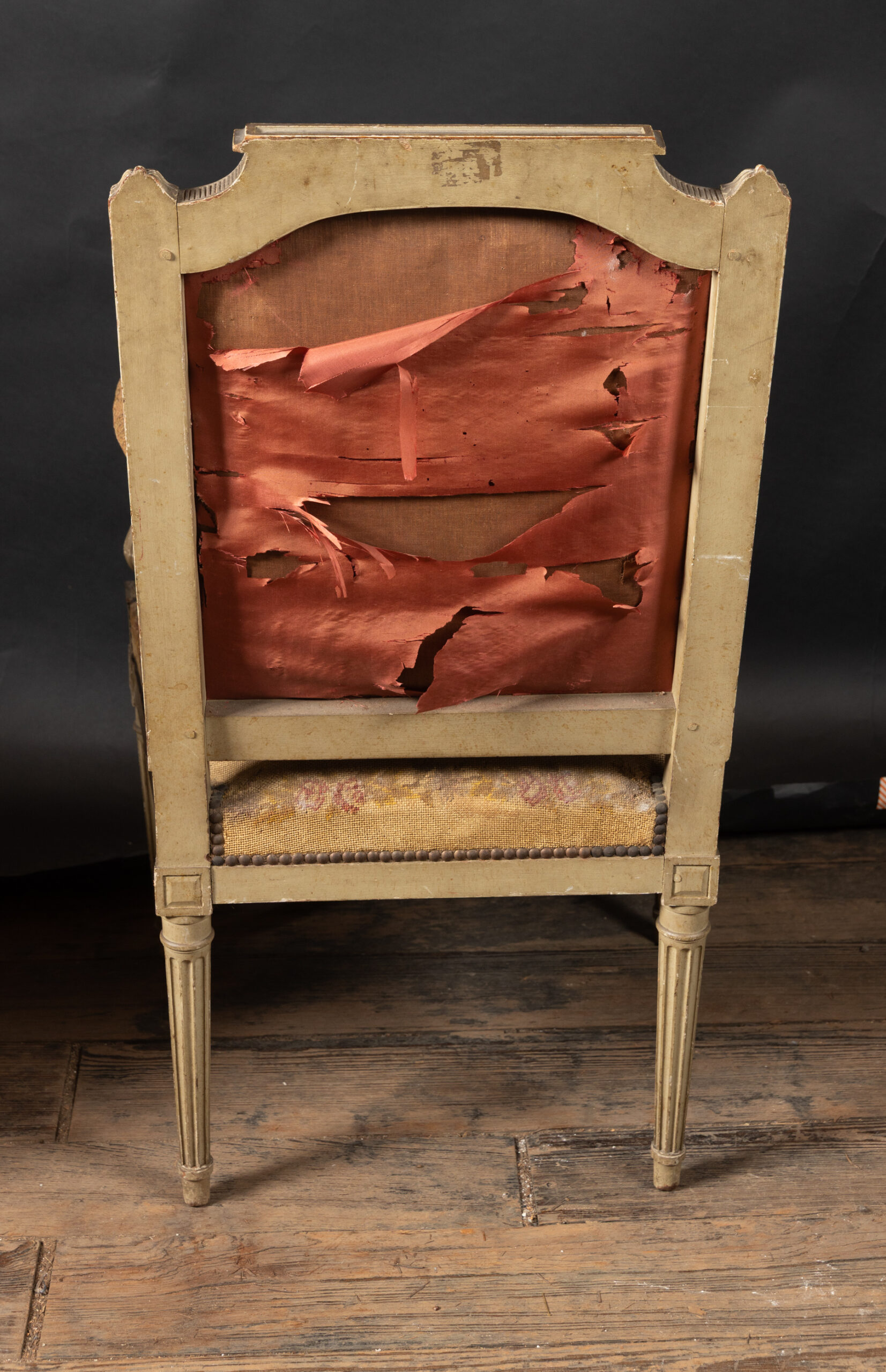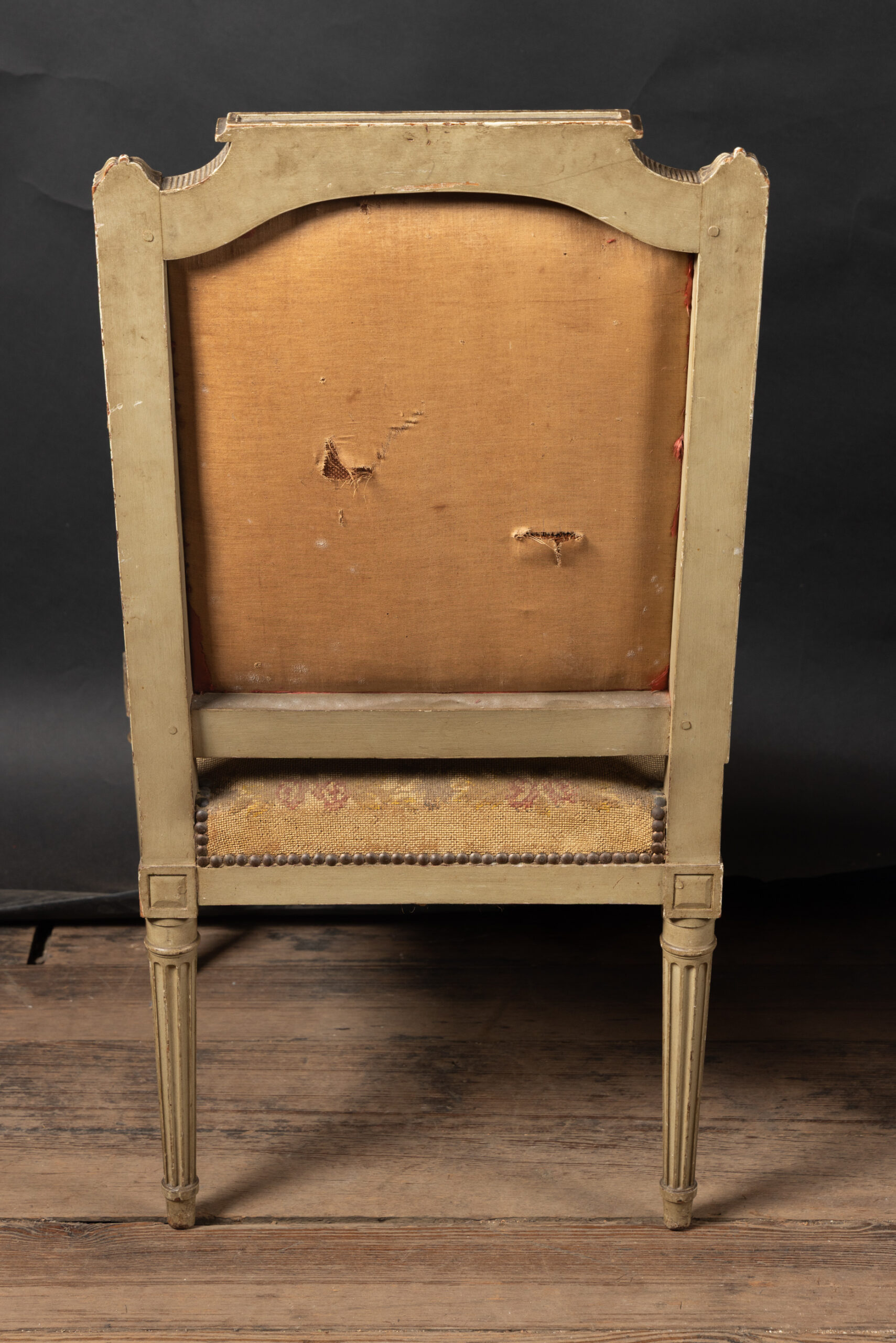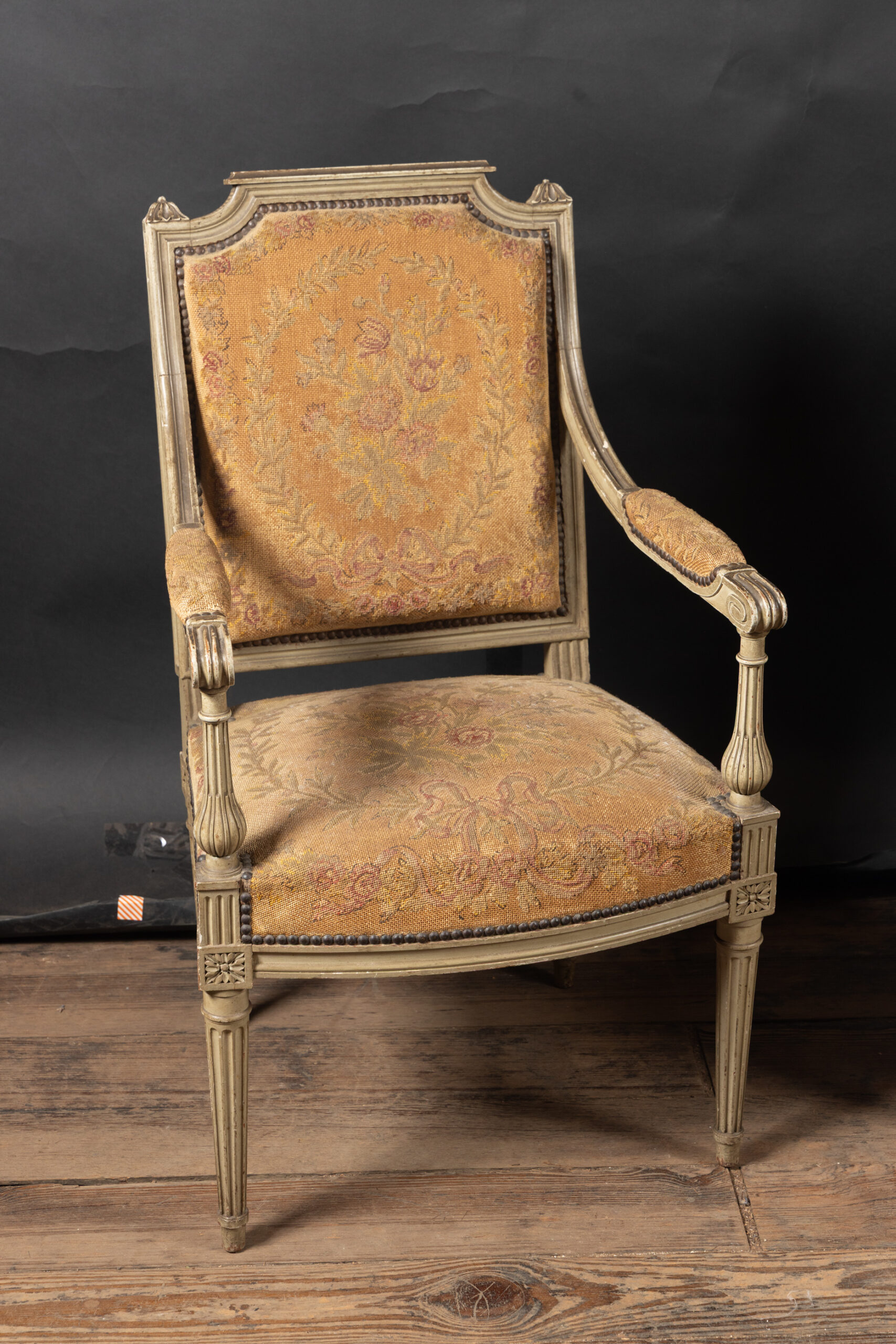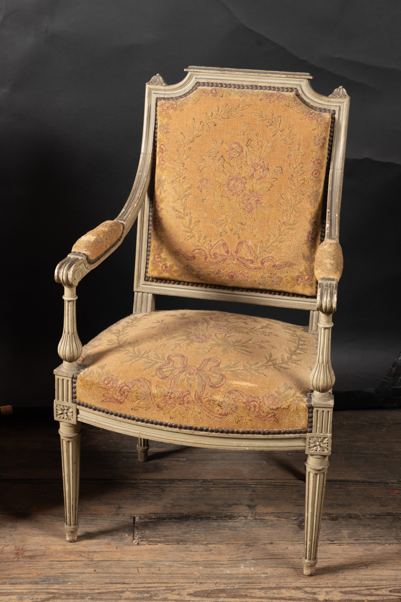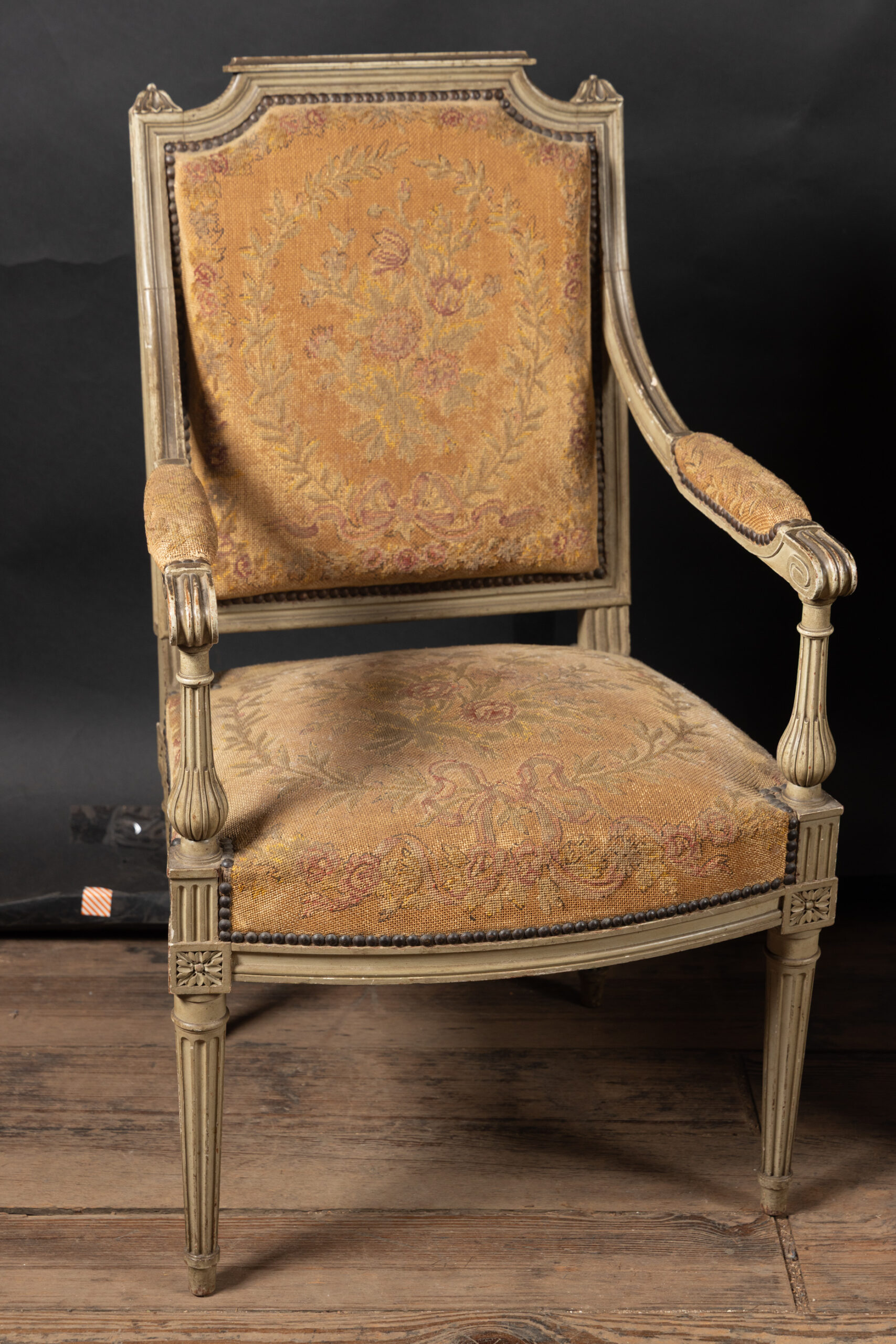 Showcasing an elegant pair of painted French fauteuil armchairs in the grand Louis XVI style with classical frames upholstered in beautiful tapestry. The chairs date back to the 19th century and feature square backs with fluted elements and marguerites at the top of each corner, classic to the timeless Louis XVI style. The arms end in fine curved scrolls and play host to padded elements with the same tapestry. The pair finishes on tapered, fluted legs and rests on small feet. Each element combines with the unique patina to yield a fine example of the Louis XVI style, poised to bring a French charm to any interior design.Â