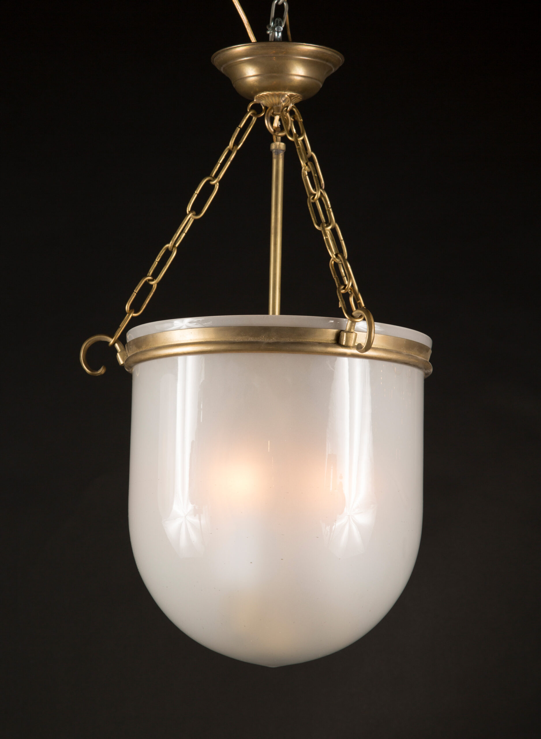 Pair of Italian 20th century hanging melon lights with satin glass globe held by brass ring, suspended by three brass chains from brass top.