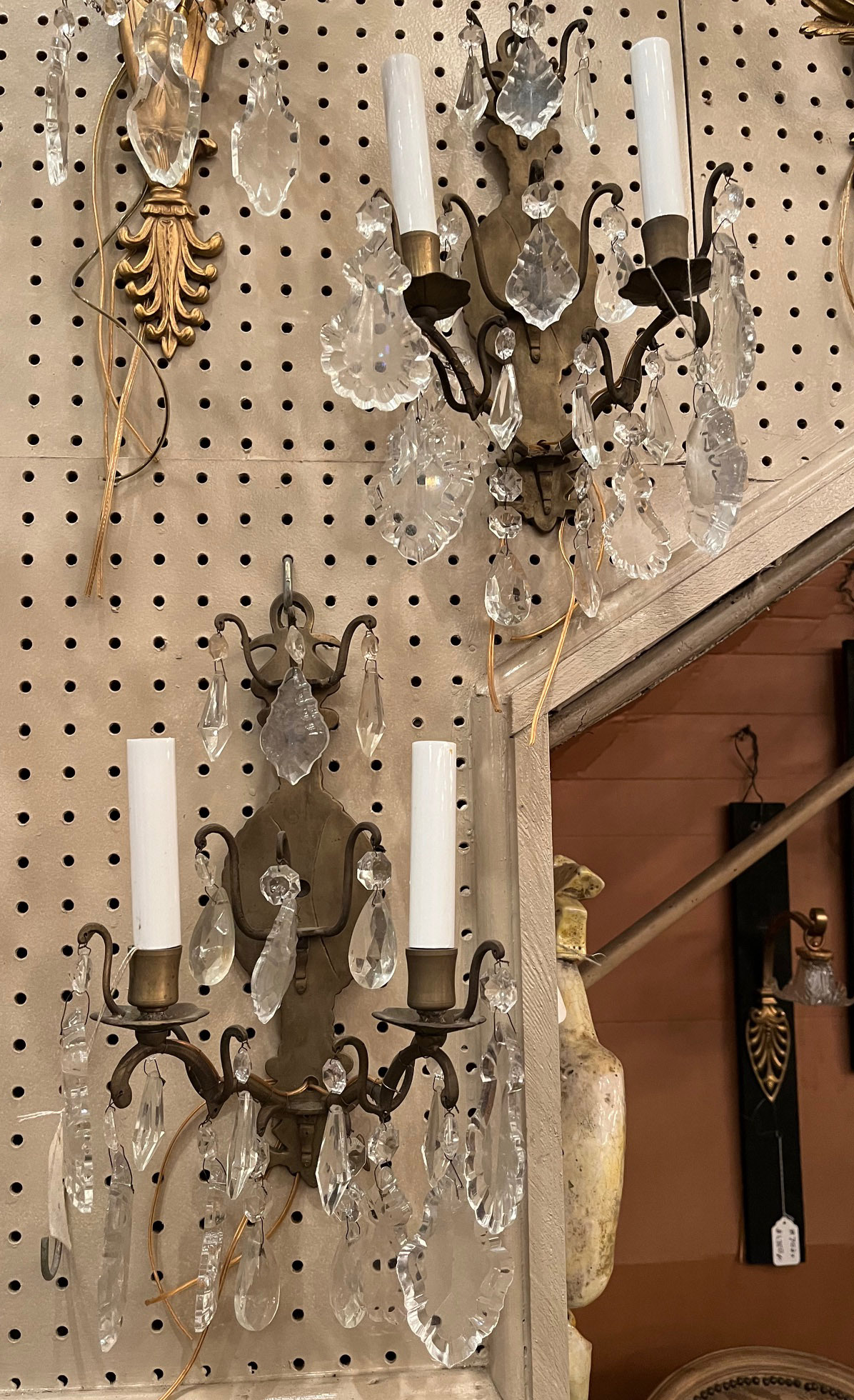Pair of Louis XV Patinated Bronze and Crystal Sconces